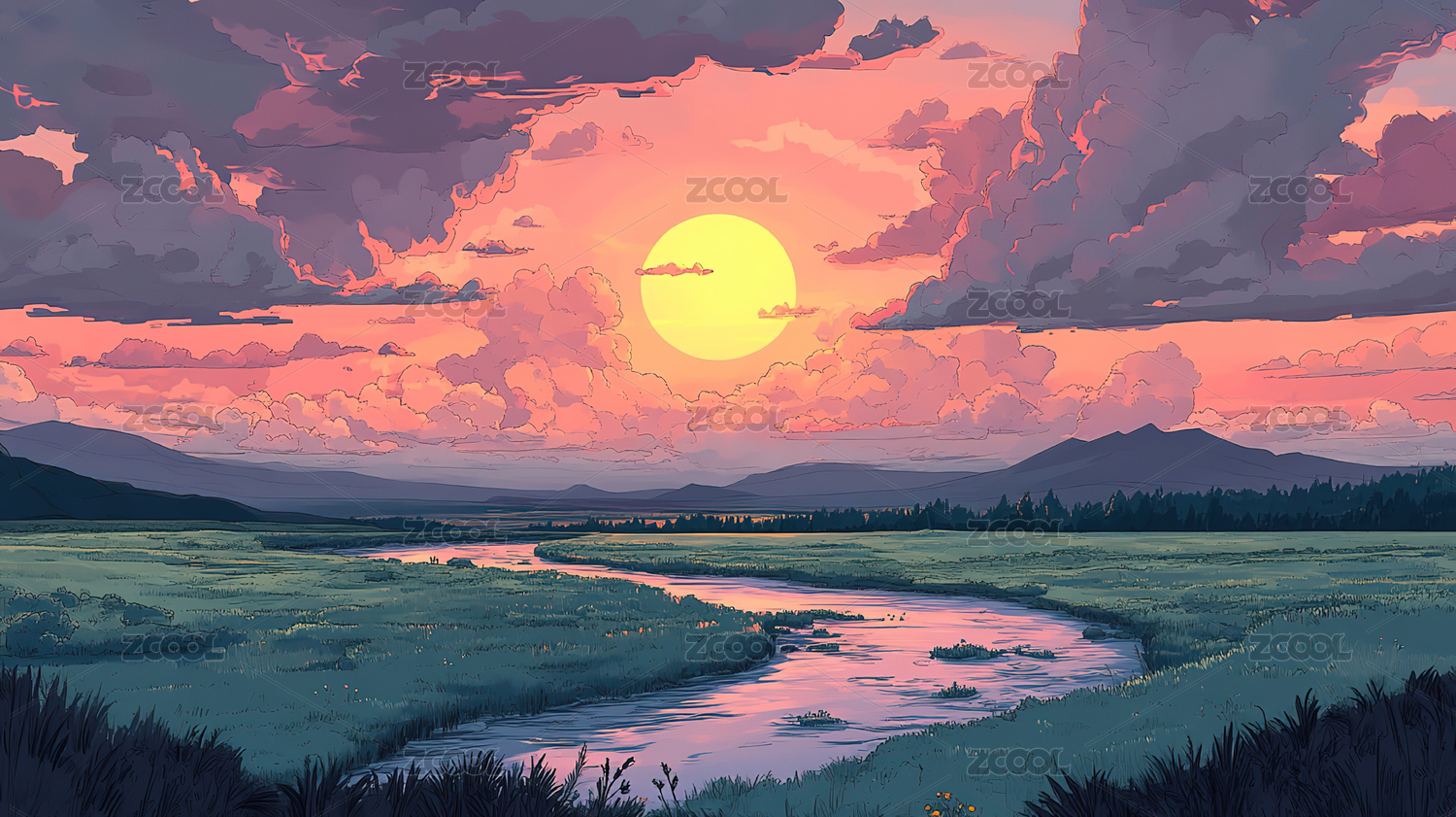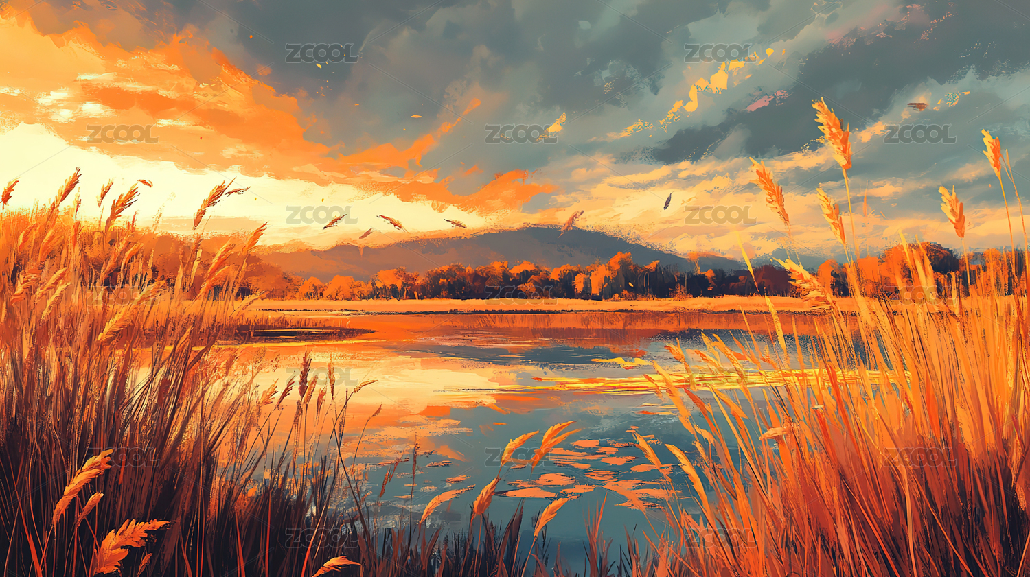 水彩风格草原湿地风光