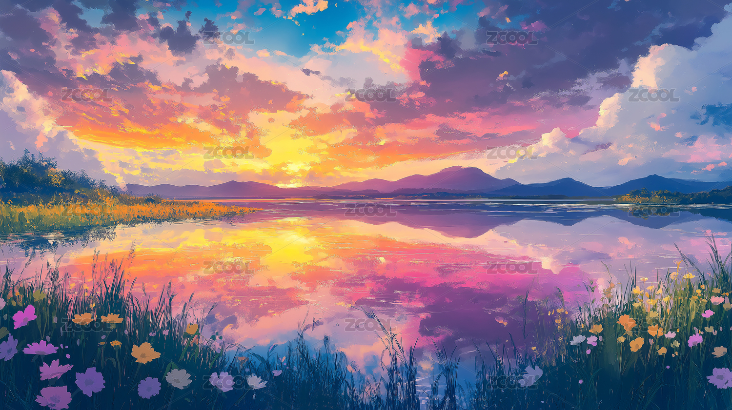 日落湖畔花海风光高清