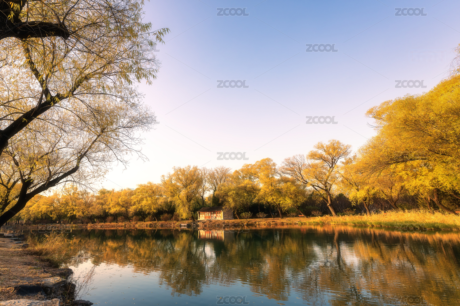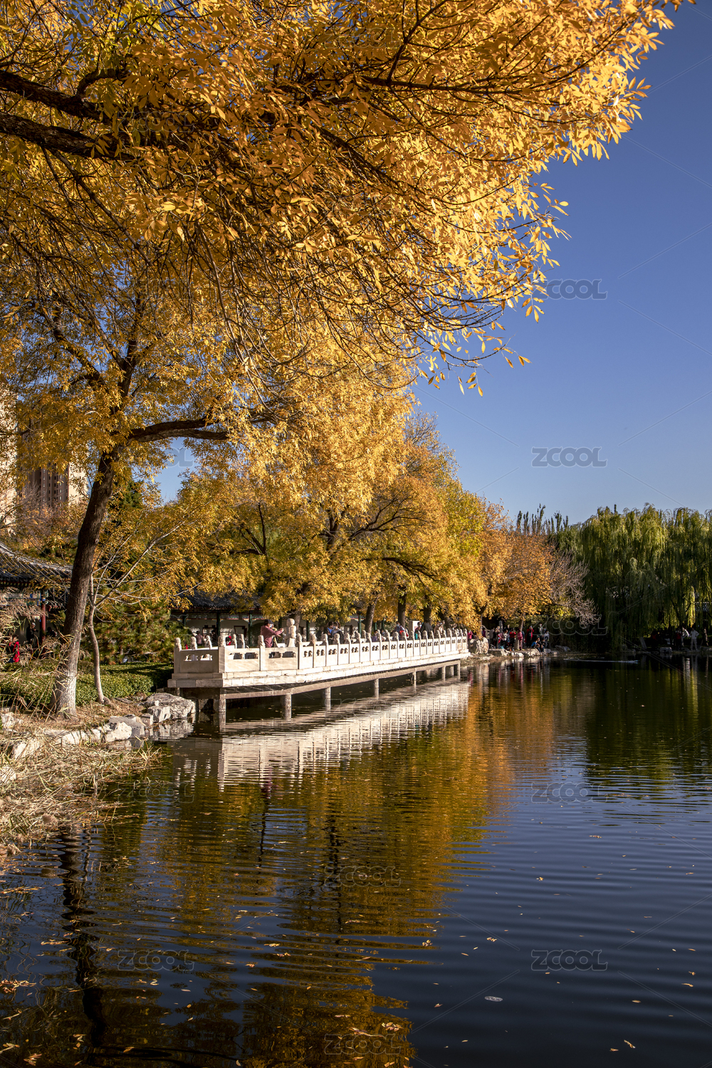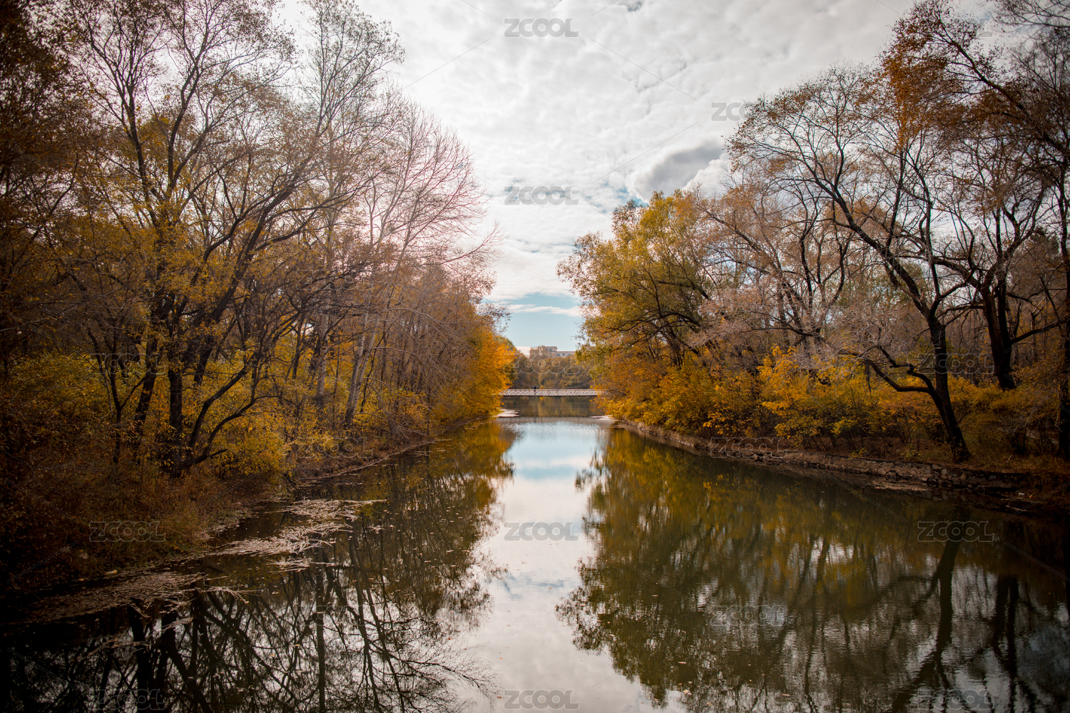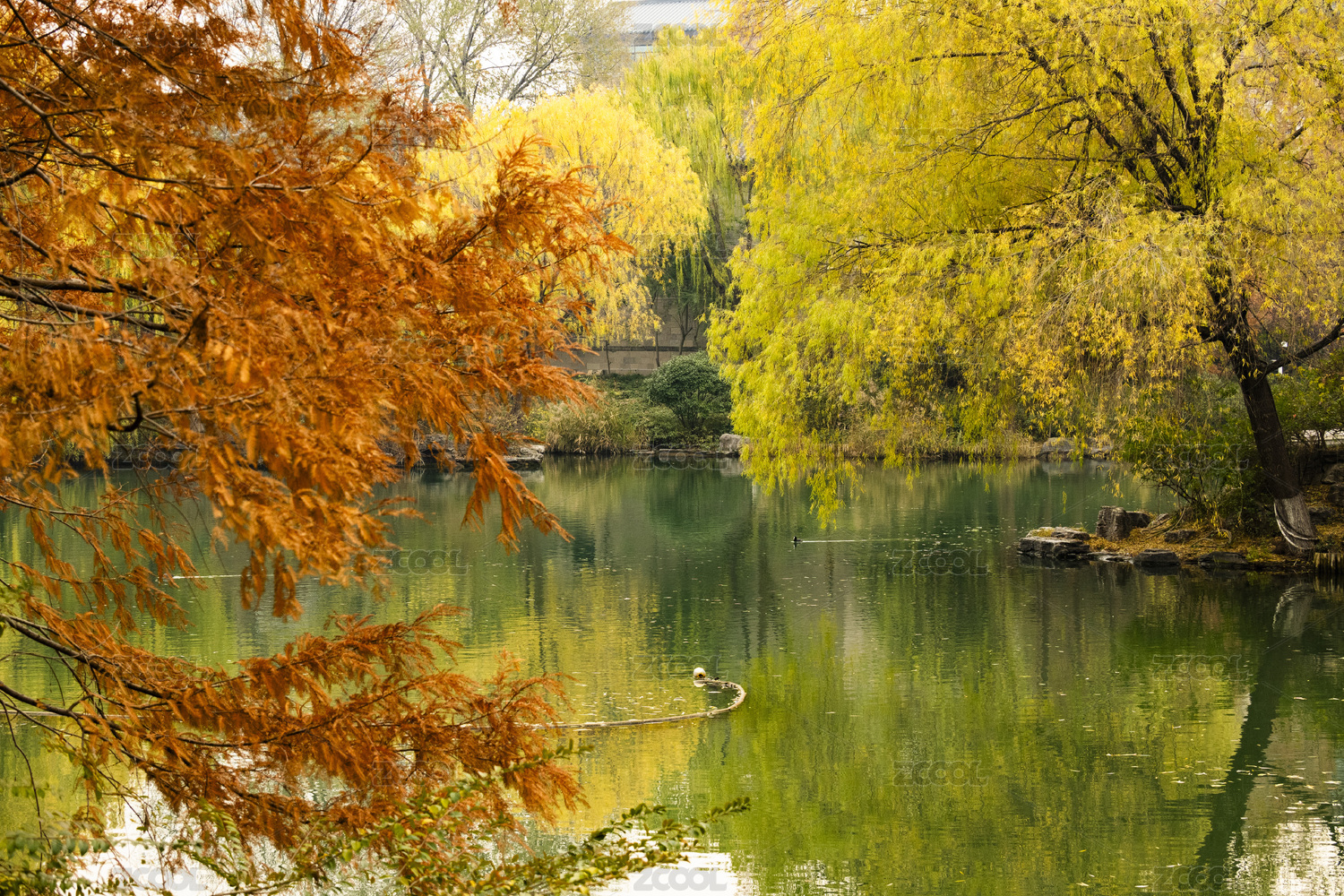 秋天中国辽宁沈阳北陵公园的河面和落叶