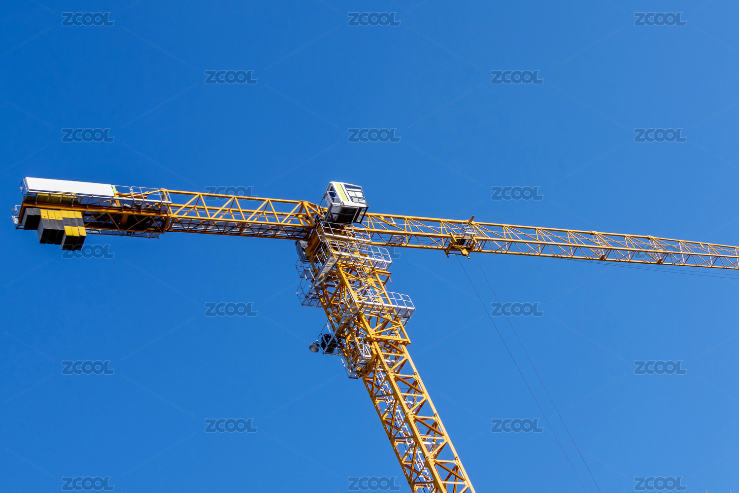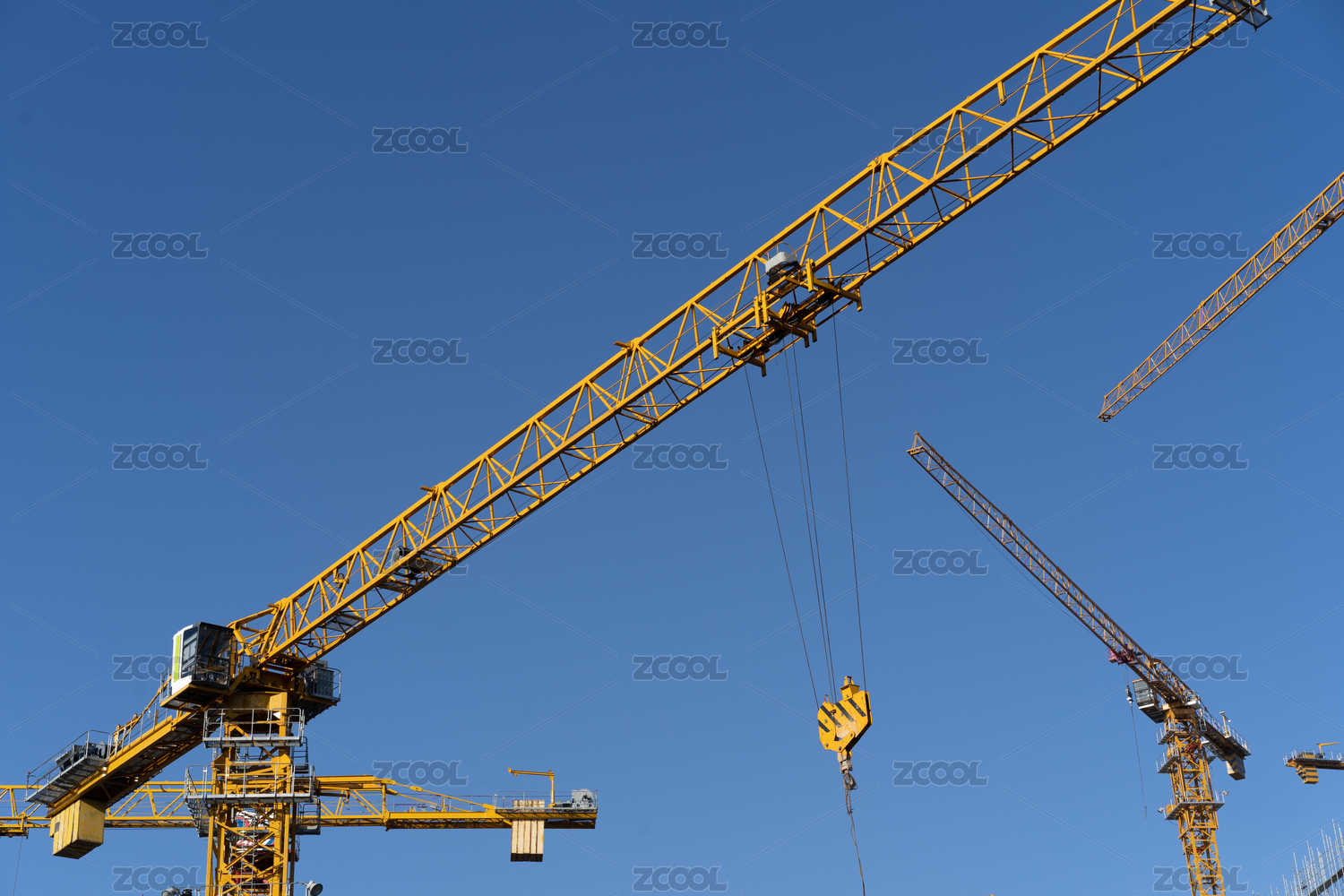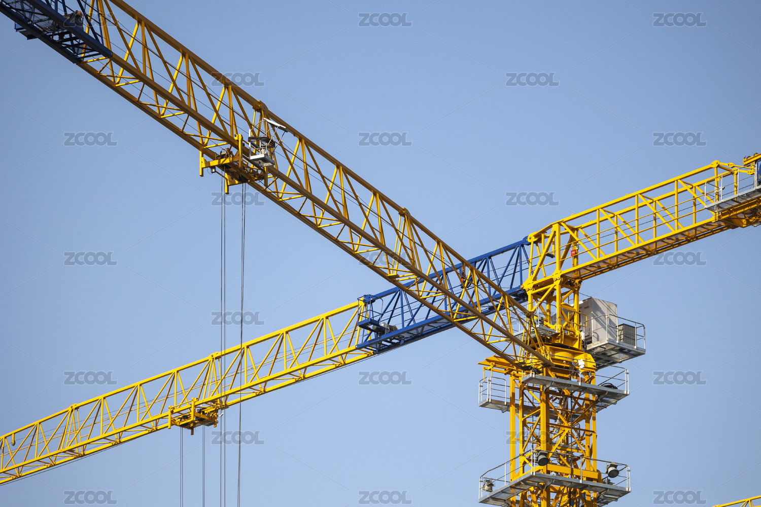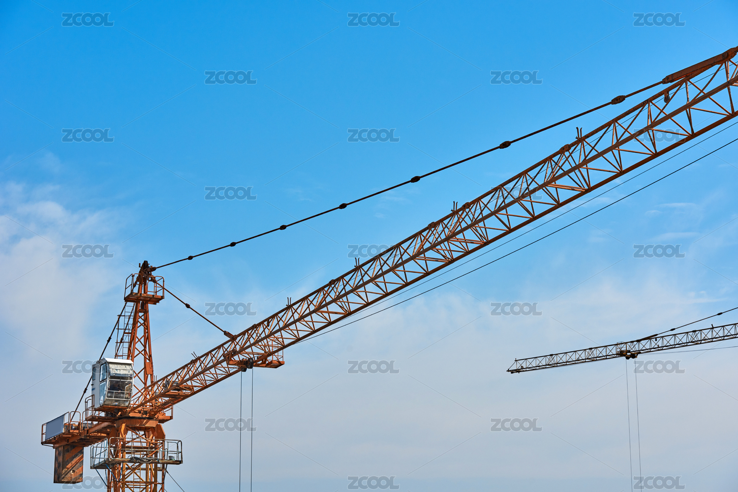 蓝天下正在施工的两个塔吊斜构图