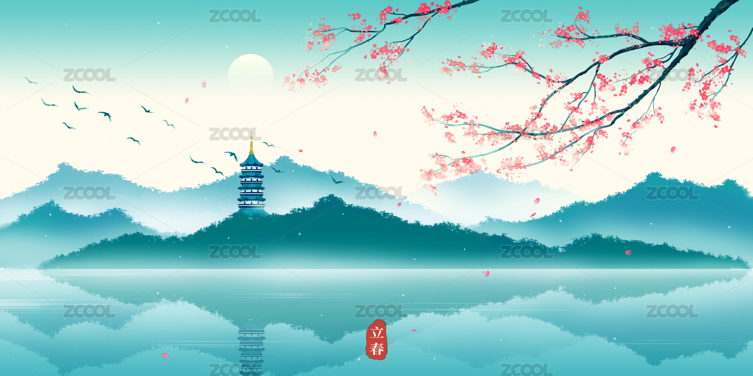 春天西湖雷峰塔山水中国风插画
