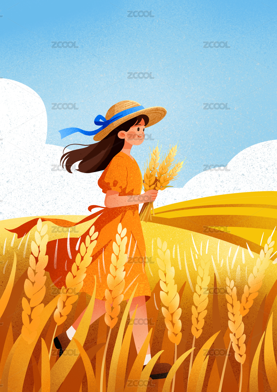 立秋节气海报秋天季节女孩丰收麦子矢量插画