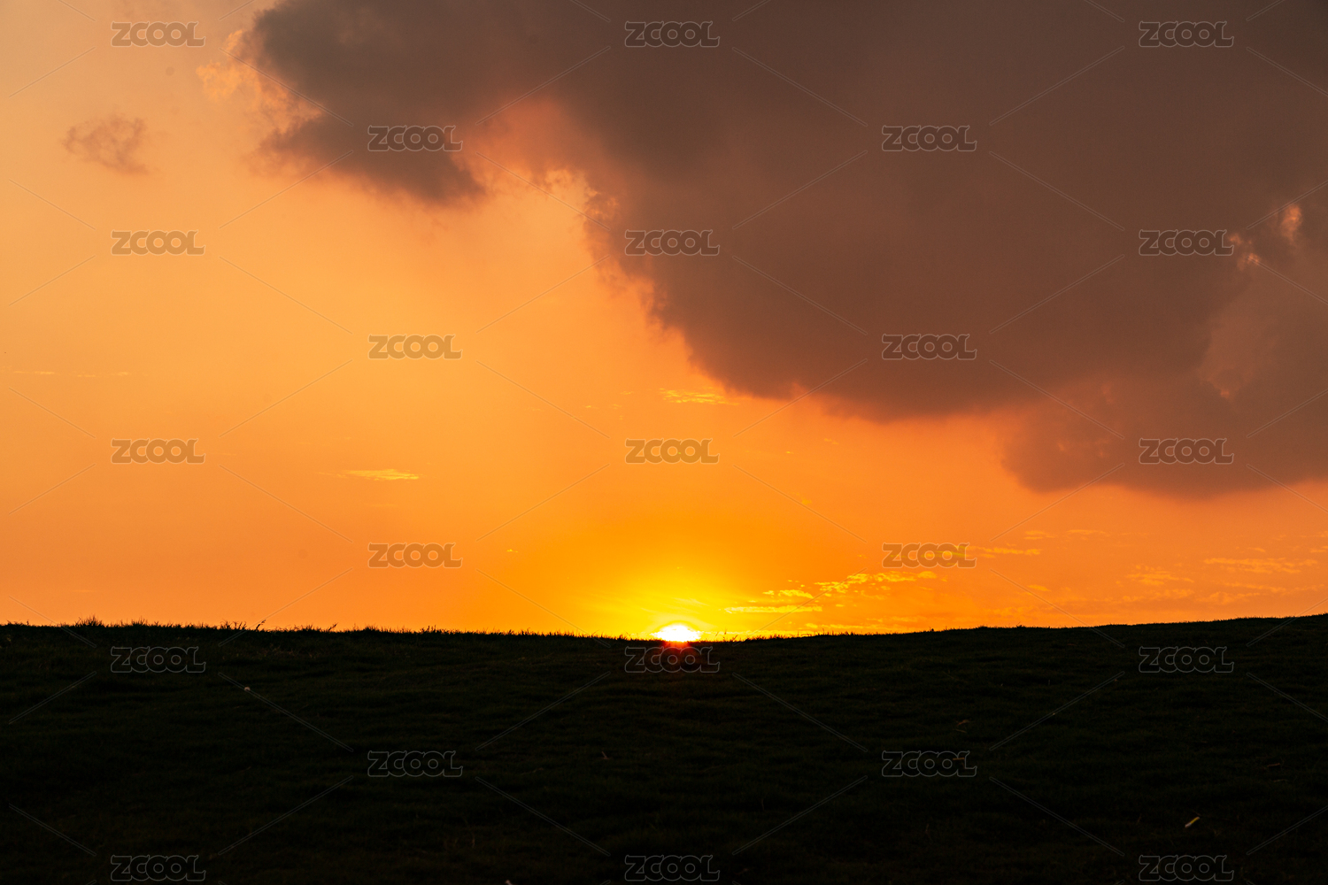 杭州良渚遗址公园夕阳下田野上的树木和天空