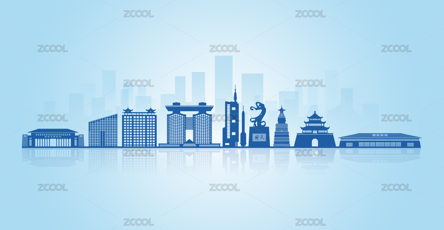 中国甘肃省酒泉市地标建筑剪影城市天际线背景