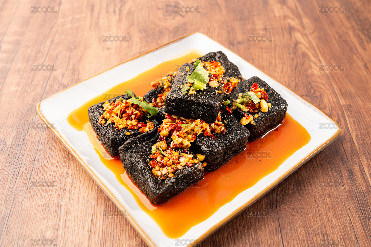 暗色木纹桌上放着一盘蒜泥烤茄子