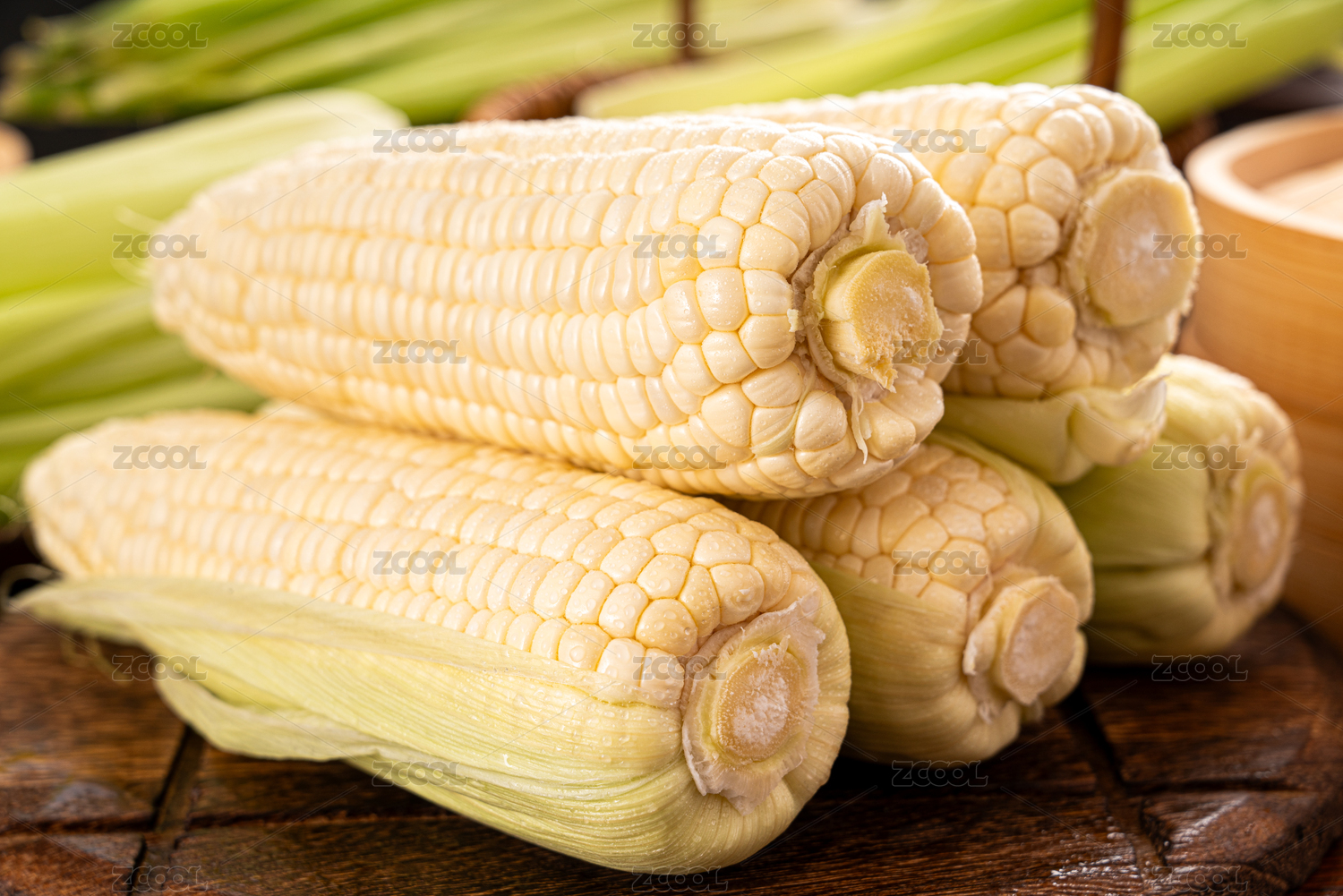 木桌上的新鲜玉米棒