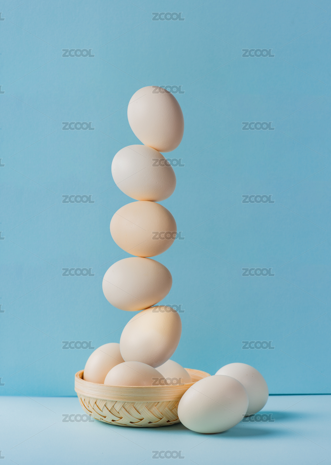 在蓝色背景里竹筐上悬浮的鸡蛋