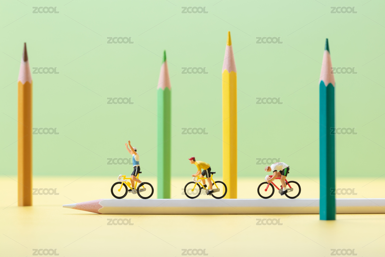 微缩创意在铅笔上冲刺的自行车手