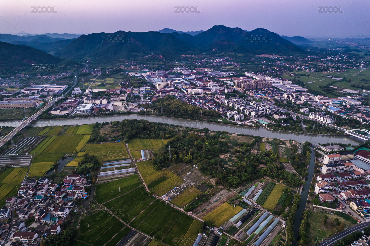 航拍,小镇,田园风光,河网,江南,水乡,地形,山峦,日暮光