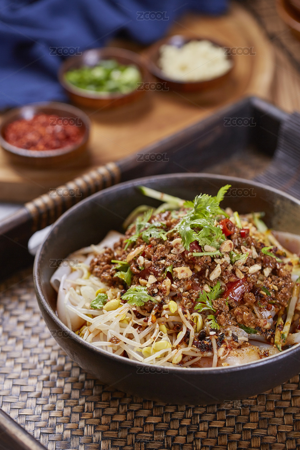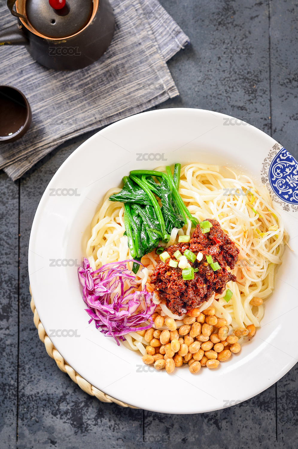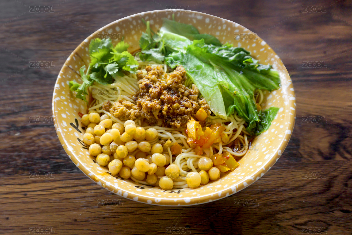 木质餐桌上的一碗中国传统美食肉哨子干拌面