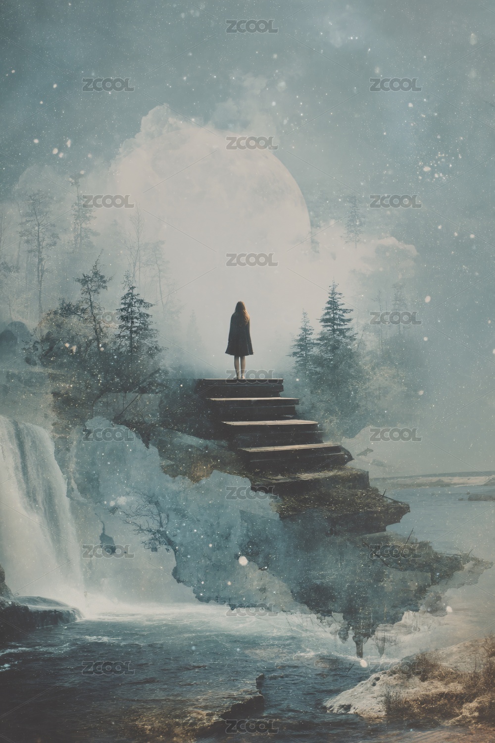 彩晕染, 极简构图, 瀑布, 黑白, 人影, S型小路, 蓝色调, 大小对比, 磨砂颗粒,手绘