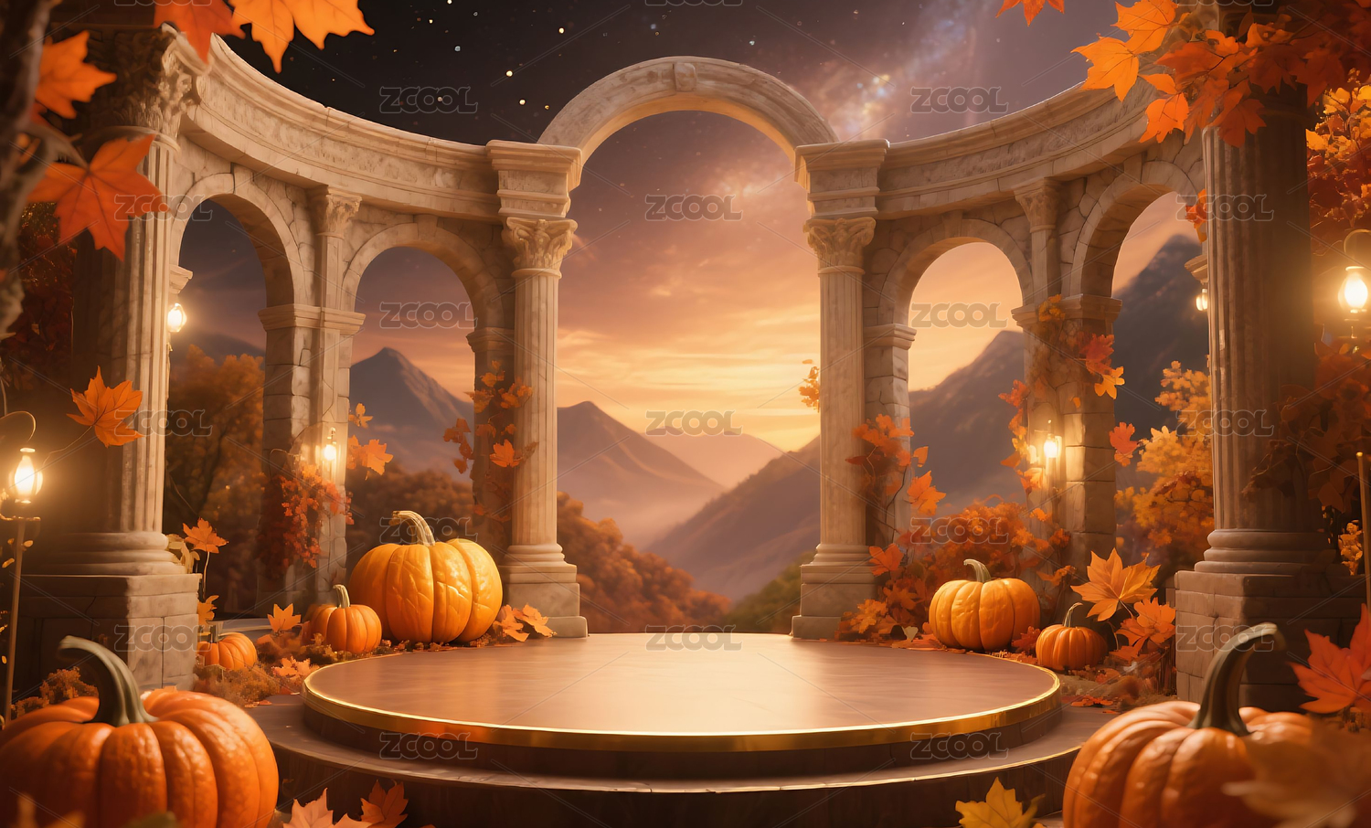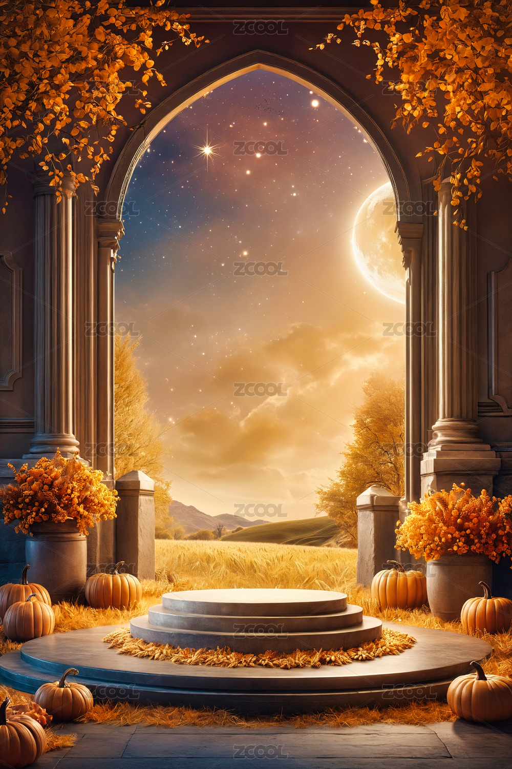 南瓜,月亮,夜晚,城堡,树木,石阶,云朵,灯笼,星星,秋天
