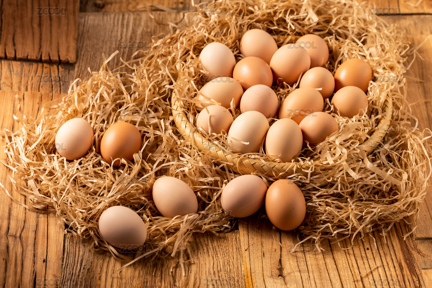 一筐鸡蛋在木桌上