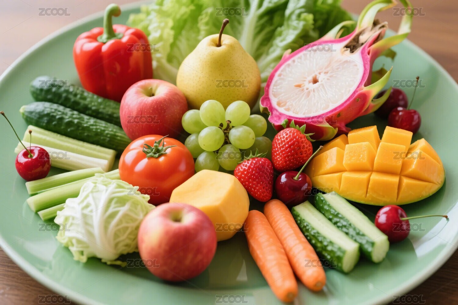 绿色红色撞色的桌面上放着一盘蔬菜沙拉减脂