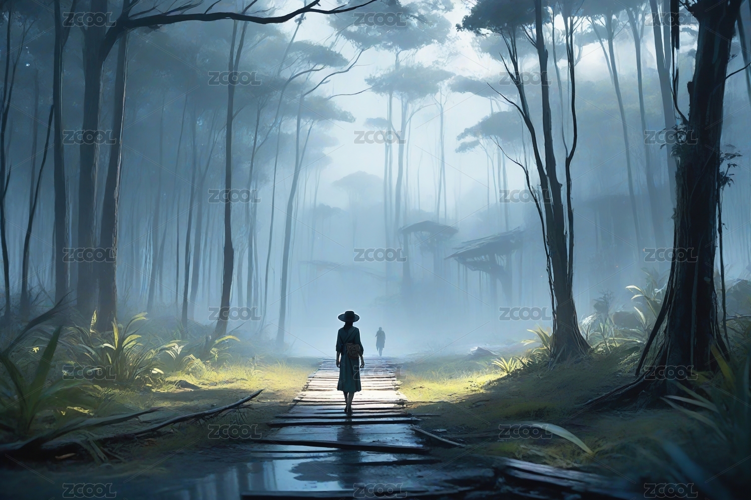 人立于林间光束下的静谧场景
