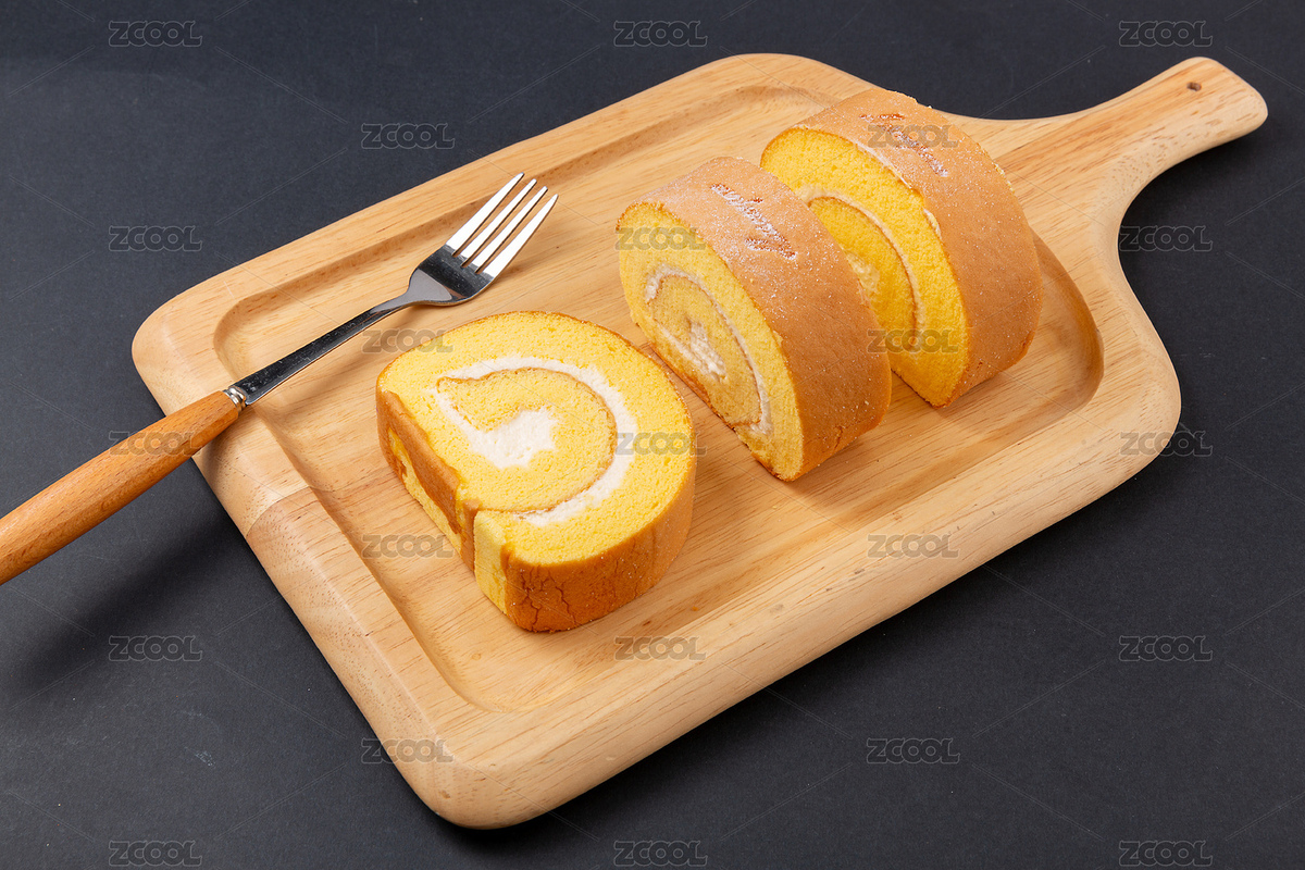 一盘鲜牛乳蛋糕卷摆放在桌面上特写