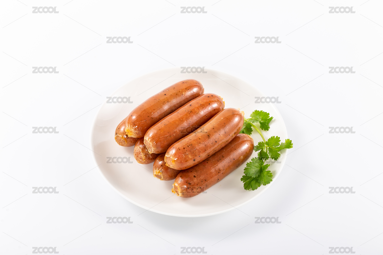 木纹背景上餐盘里摆放的哈尔滨红肠
