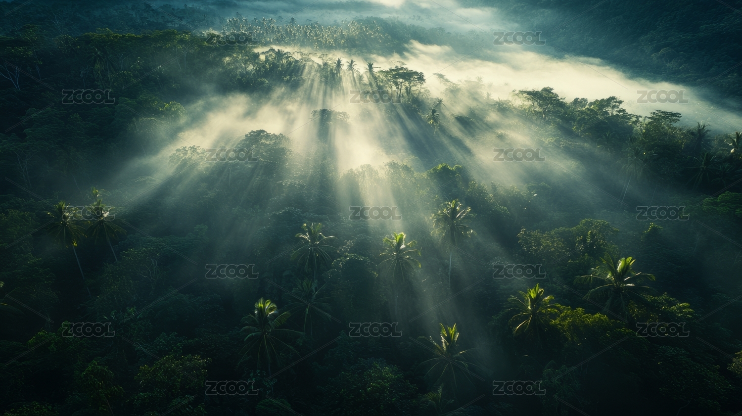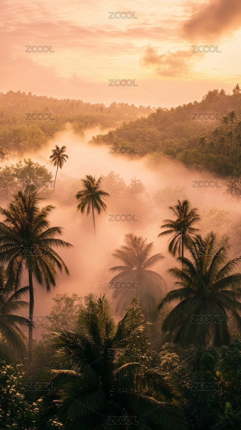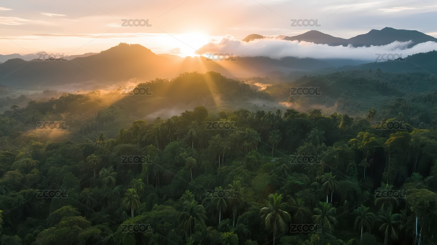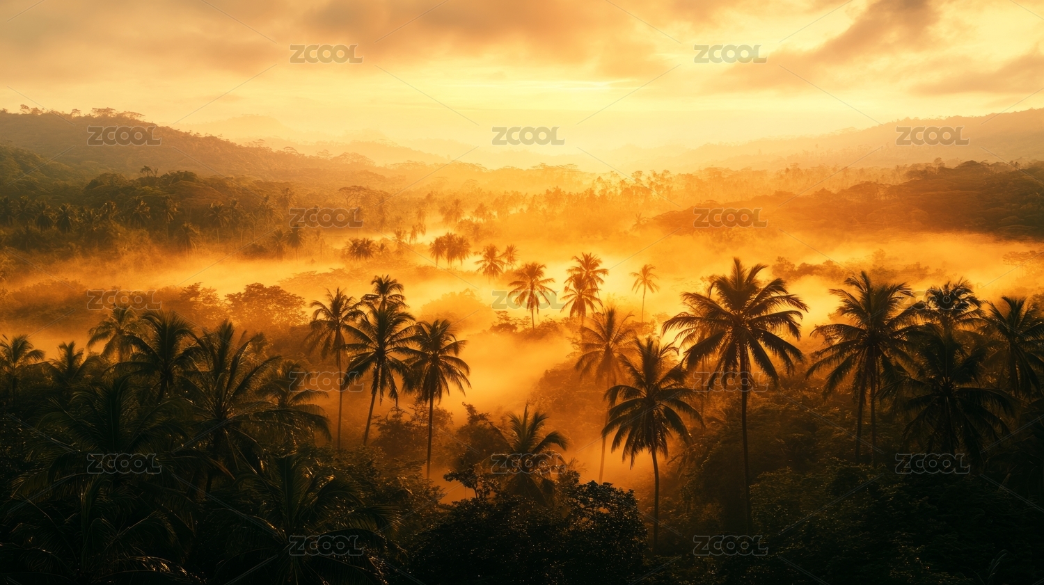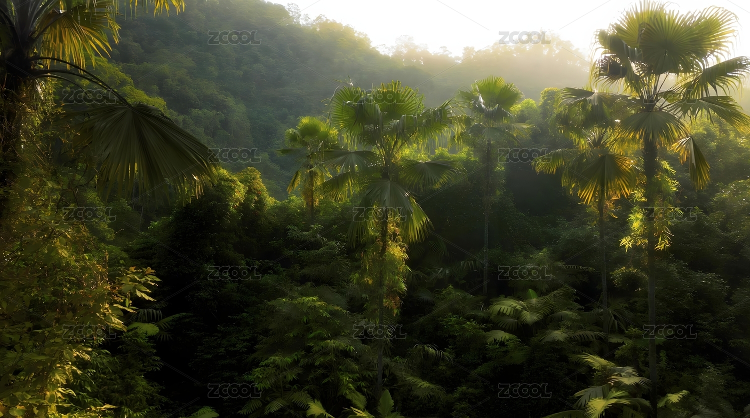 热带,雨林,山脉,椰子树,绿色,植被,茂密,山谷,晨雾,阳光