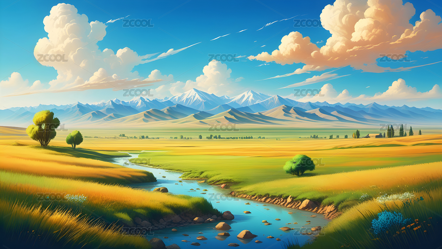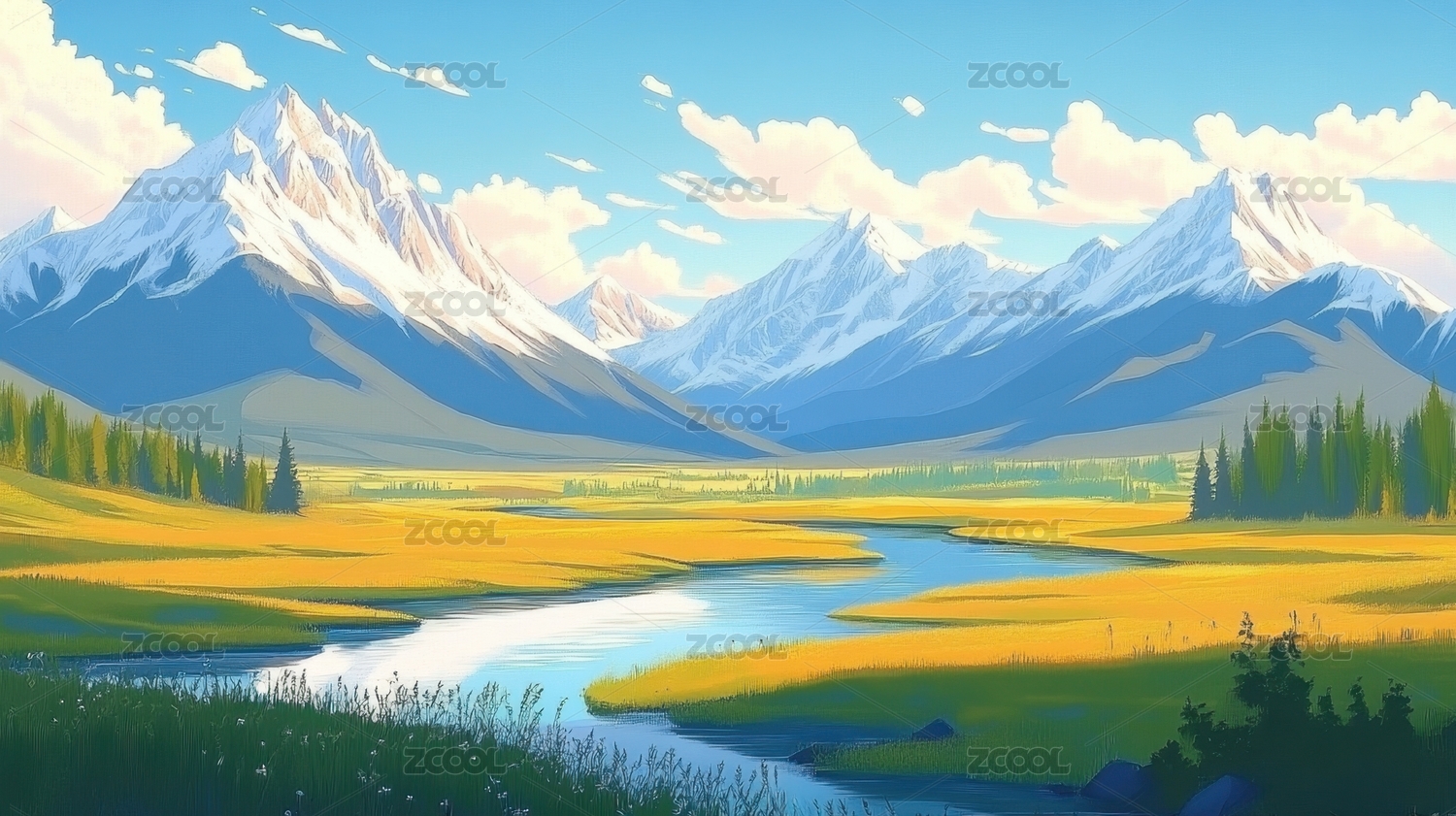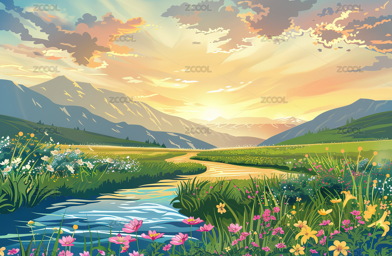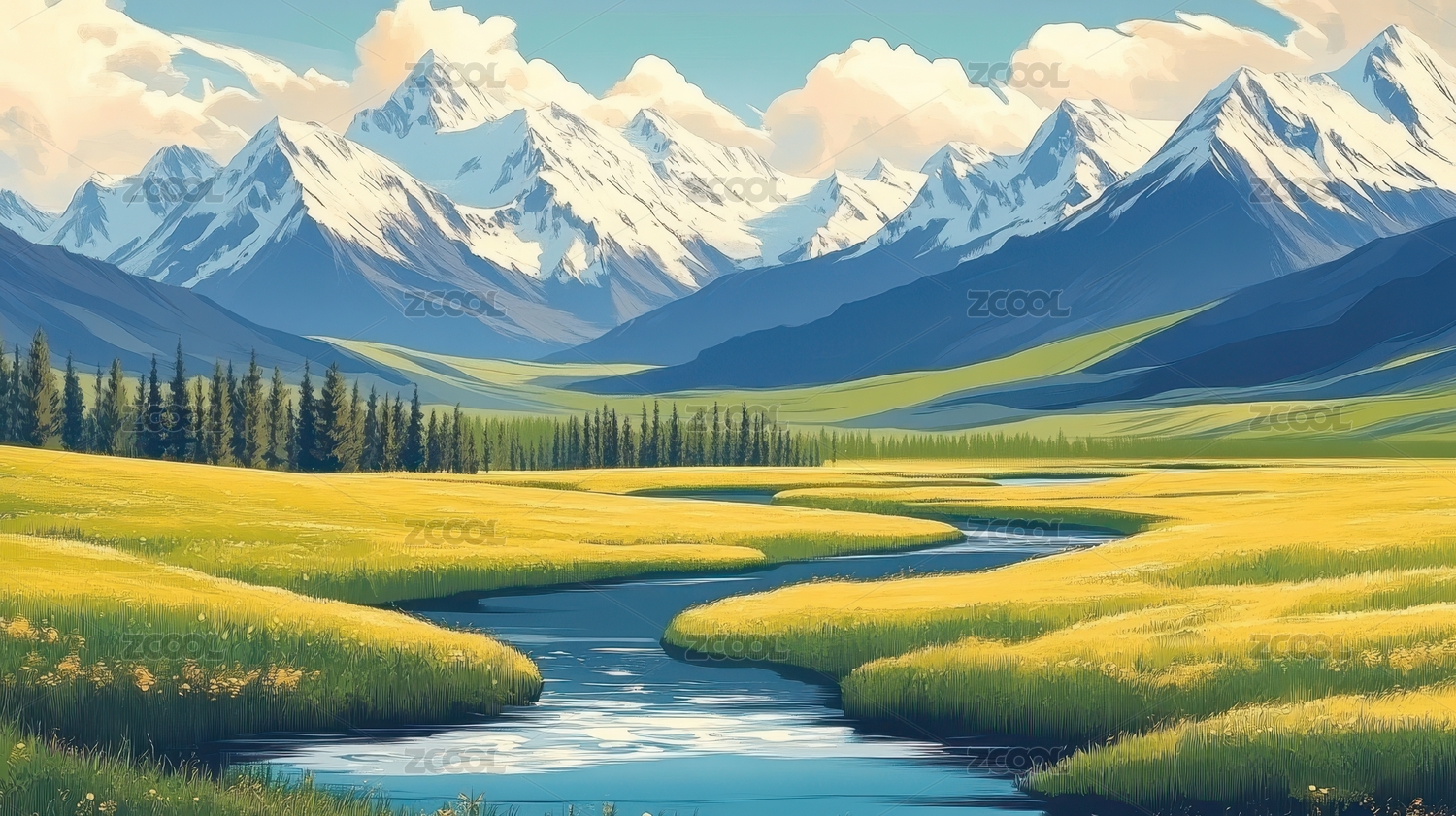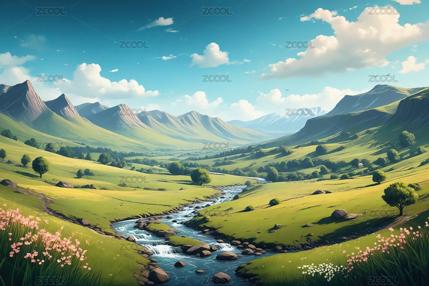 山谷,河流,草地,山脉,蓝天,白云,野花,绿色,风景,自然