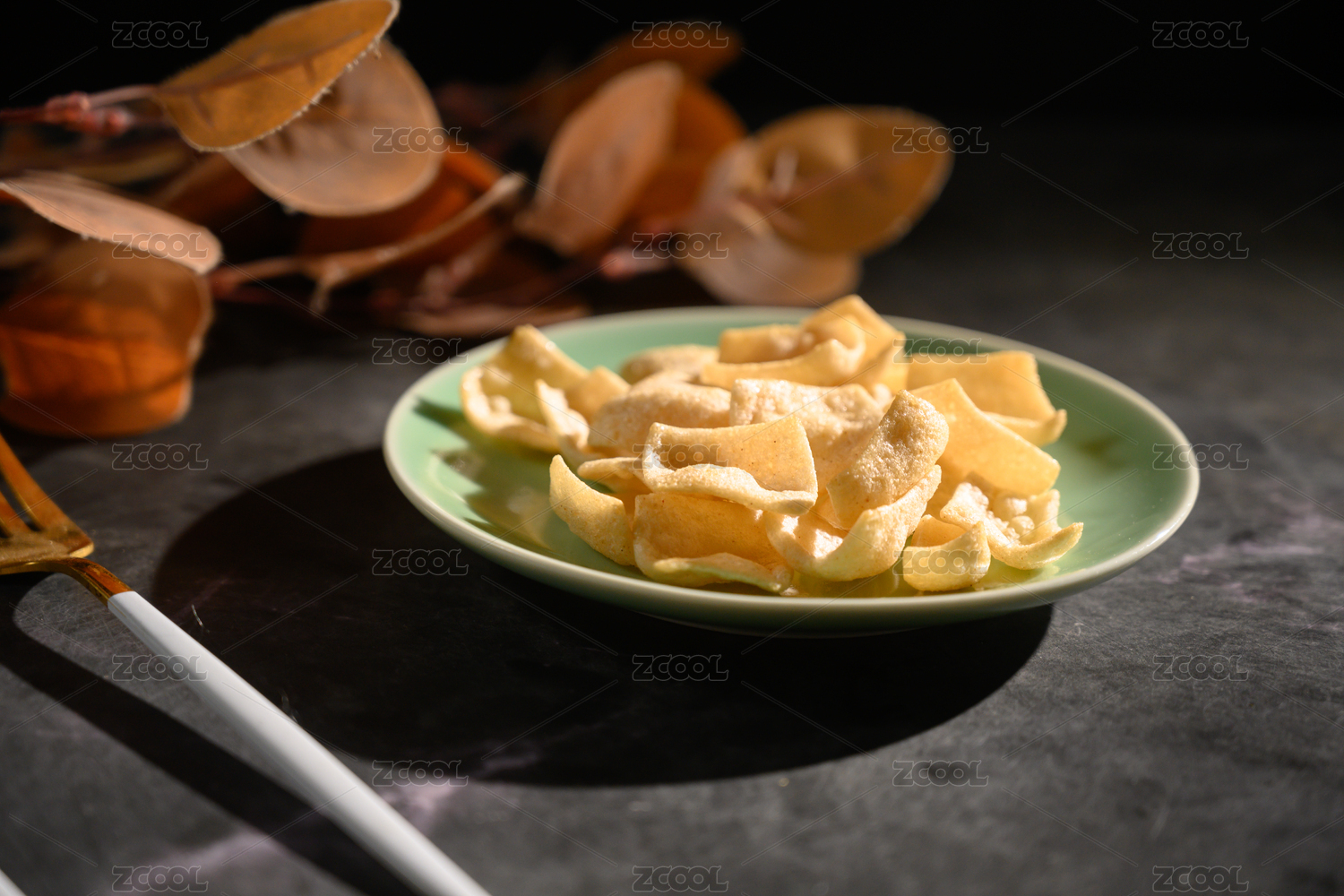 桌面上的盘子里的美味可口的虾片