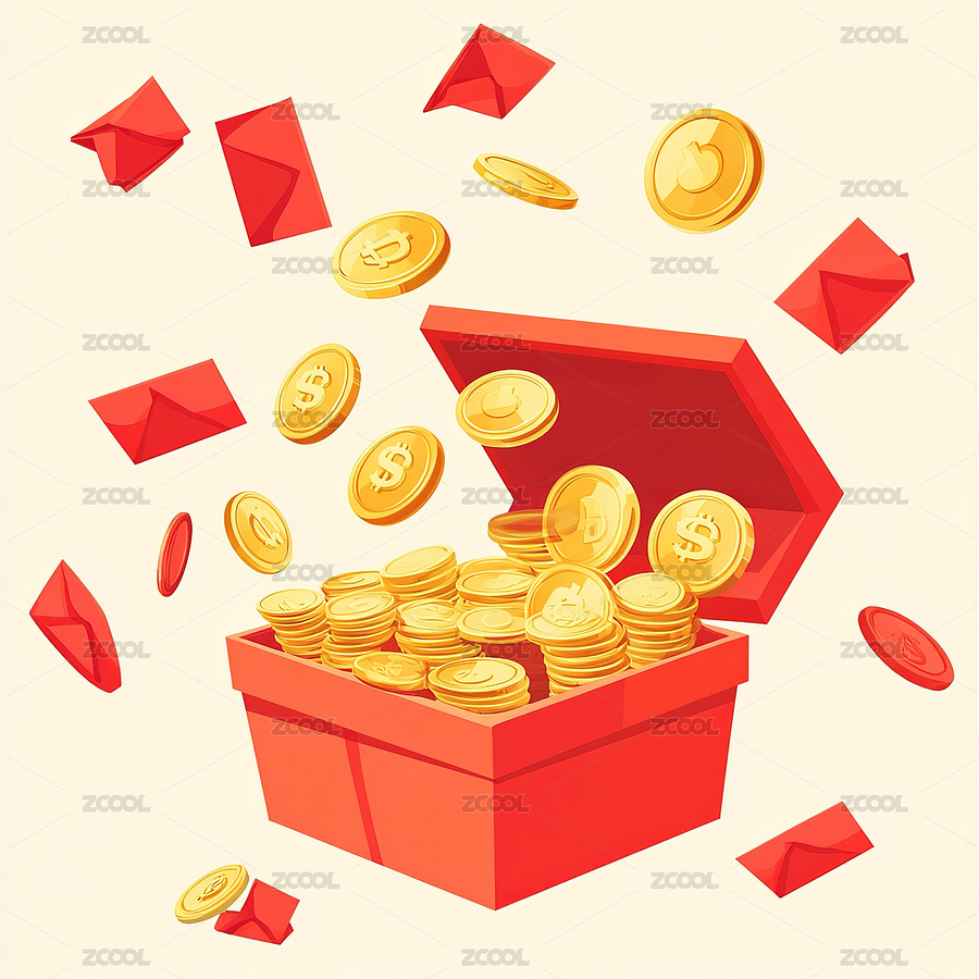 3D渲染的打开的红色礼盒红包金币优惠券礼