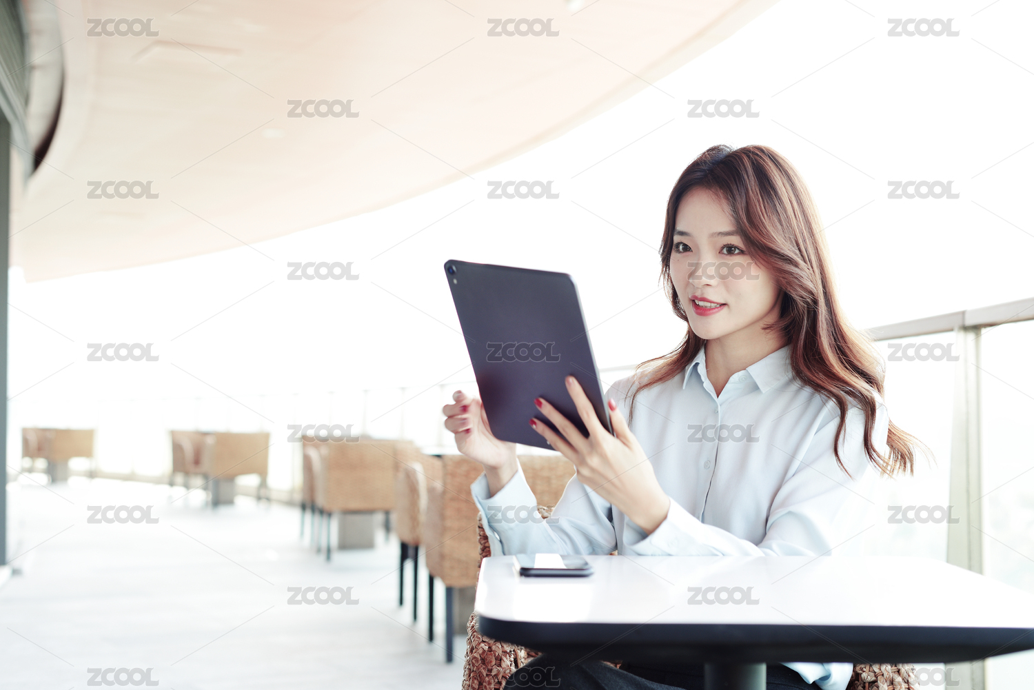 一个中国年轻女白领坐在室外咖啡厅用平板电脑