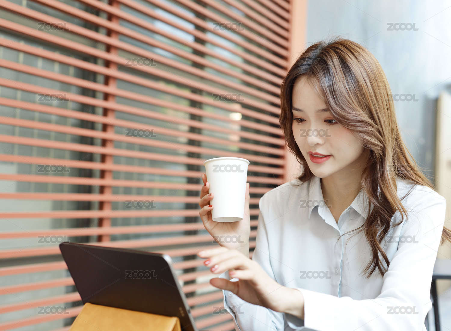 一个手拿纸杯的年轻职业女性坐在平板电脑前视频