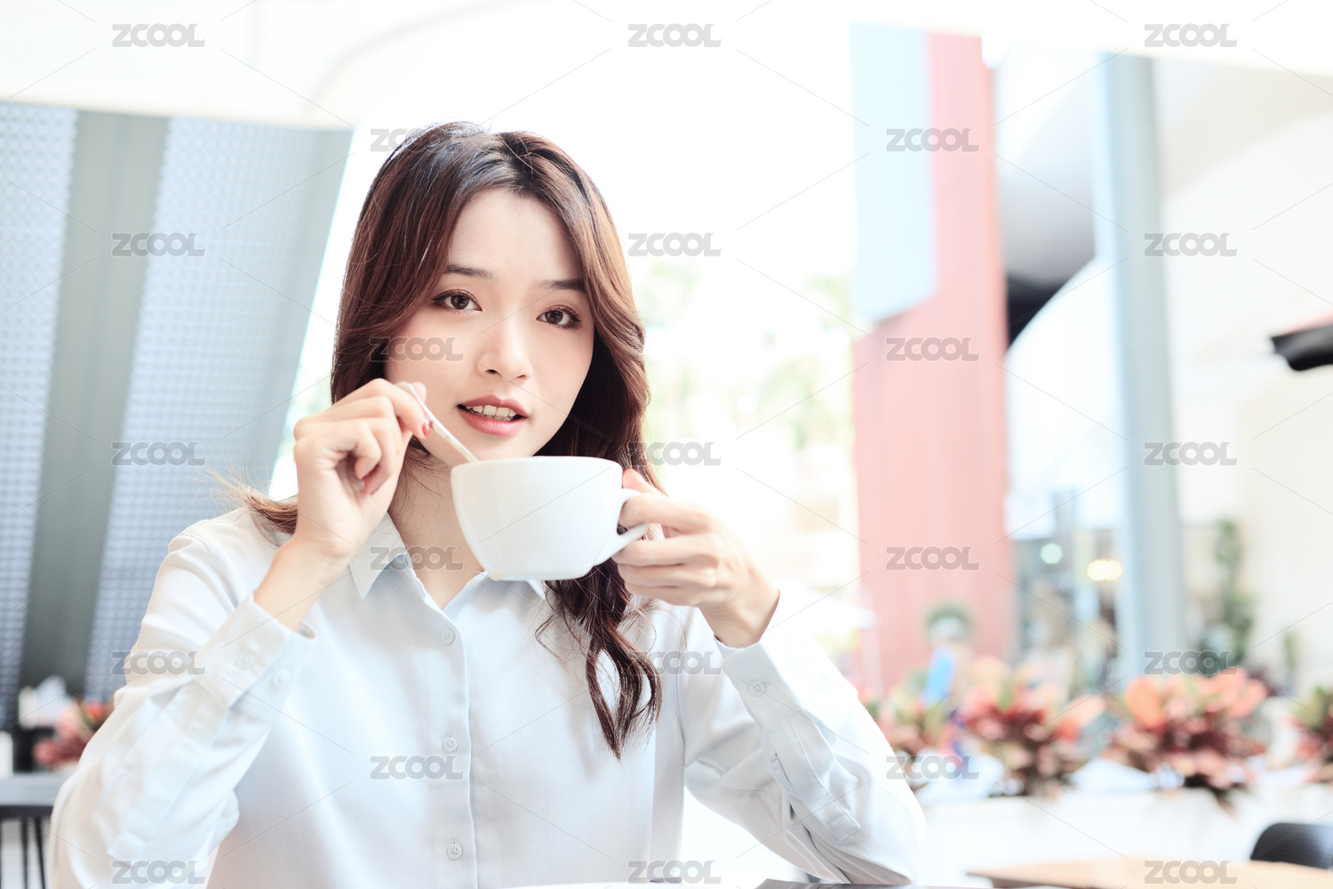 一中国年轻商务女士在喝咖啡