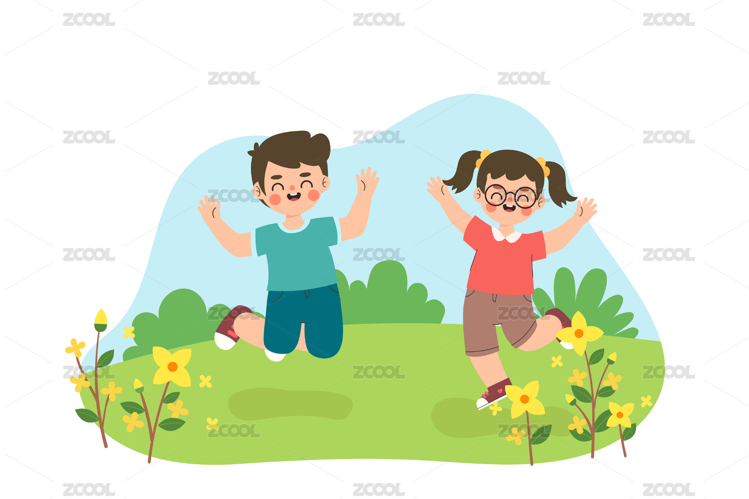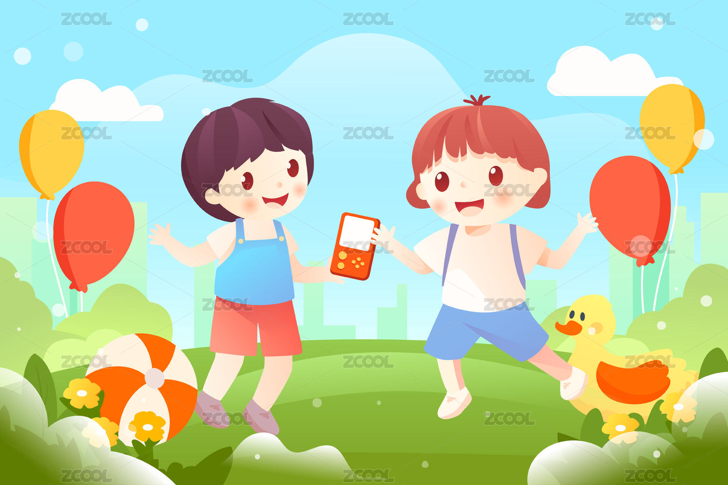 六一儿童节小孩户外玩耍夏天暑假娱乐插画