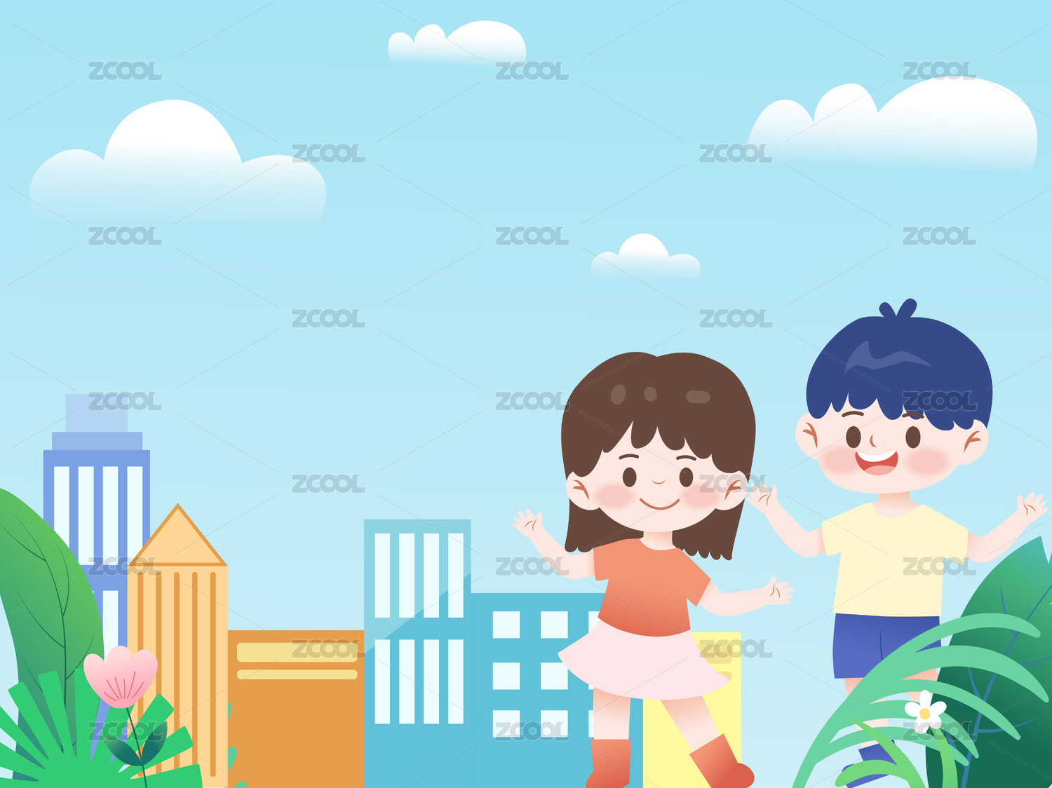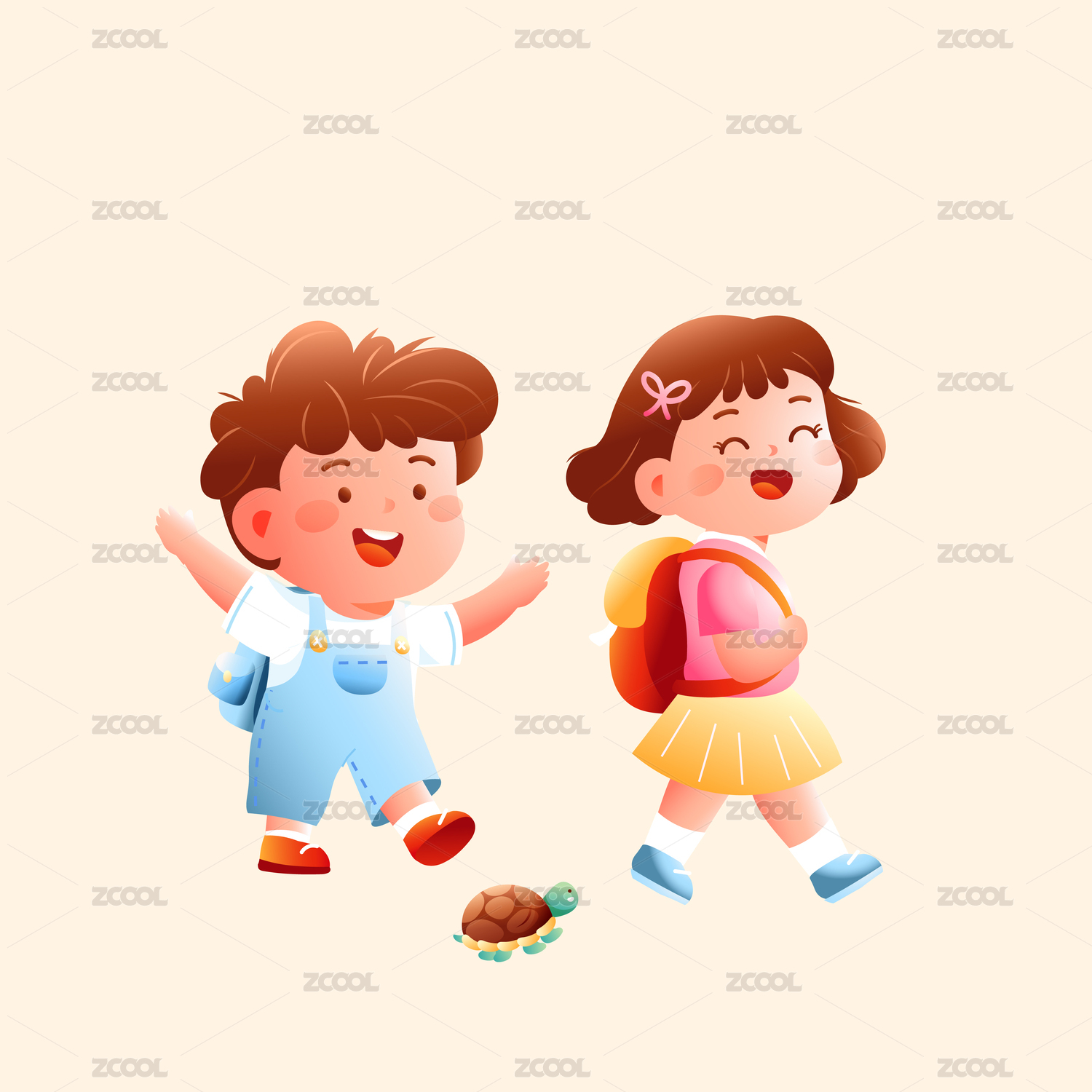 矢量插画蓝天学校植物等男孩女孩儿童开学