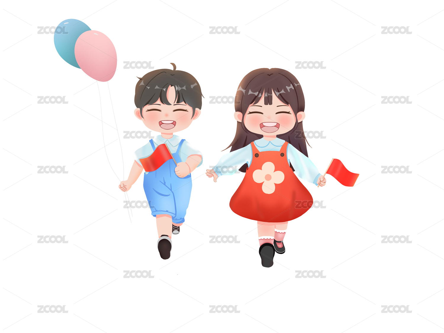 蓝红色扁平风国庆出游手拿旗子气球小孩