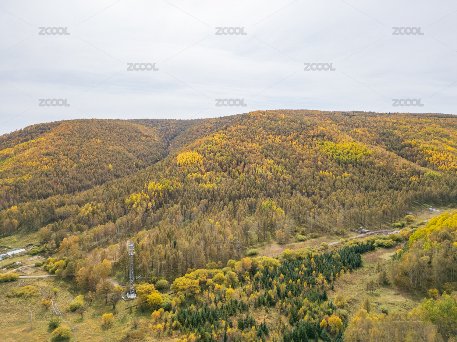 山蓝天白云下阿尔山秋天森林里树木自然风景