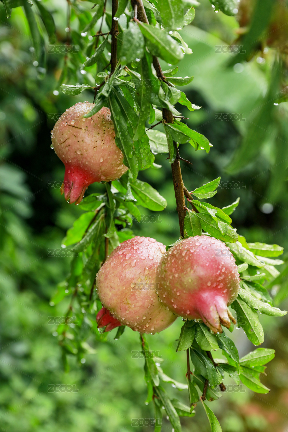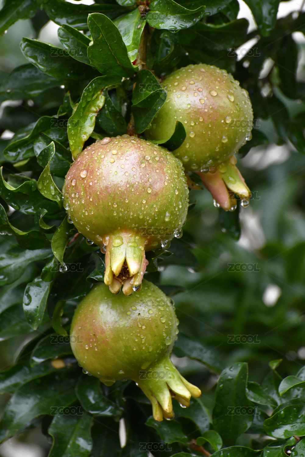 山东枣庄果园挂满雨珠的石榴幼果