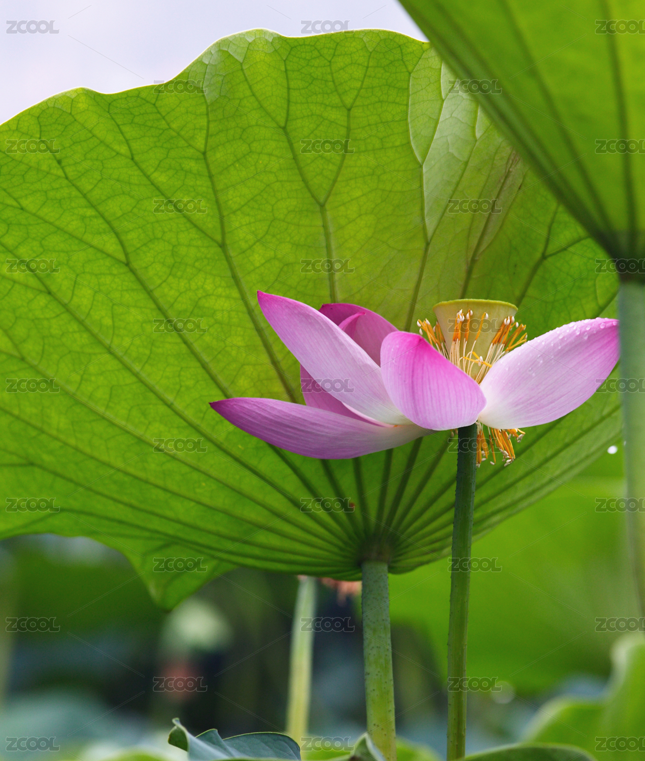 夏日骄阳下在荷叶衬托下盛开的粉色荷花