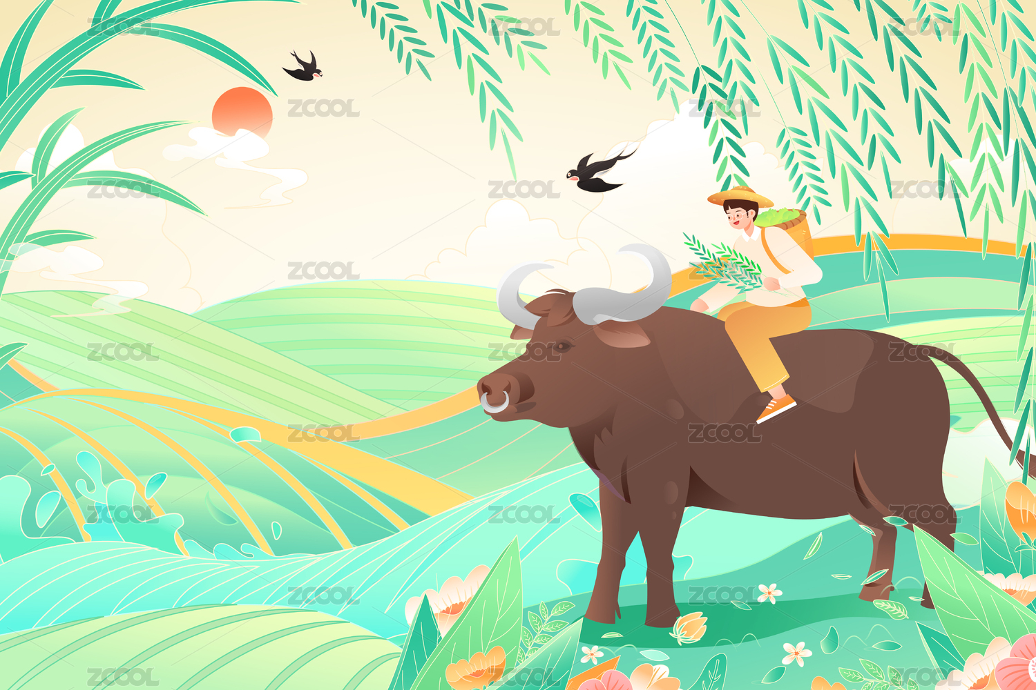 春天牧童放牛国风传统手绘国潮横版矢量插画