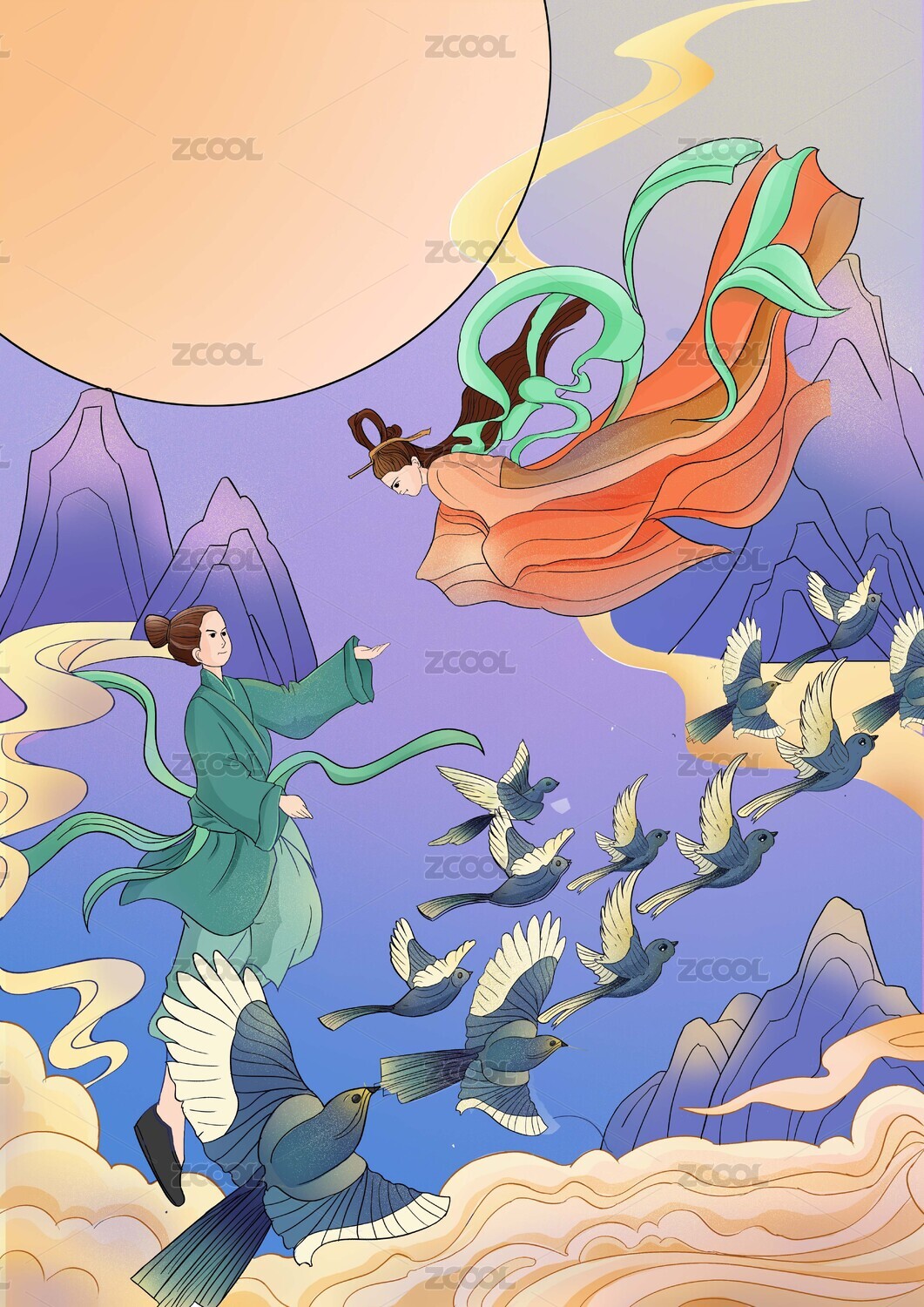 七夕节牛郎织女乞巧节鹊桥相会传统节日插画