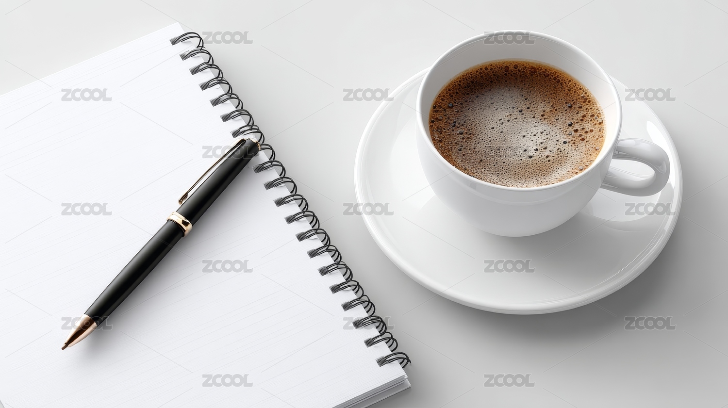 办公桌上空白的笔记本和钢笔,搭配一杯咖啡