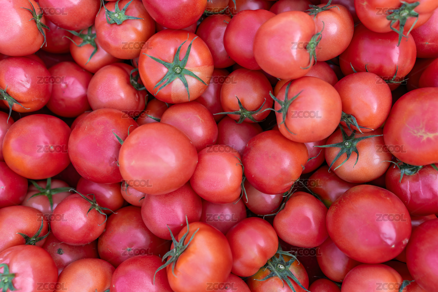 新鲜多汁的有机西红柿在农贸市场堆得很高