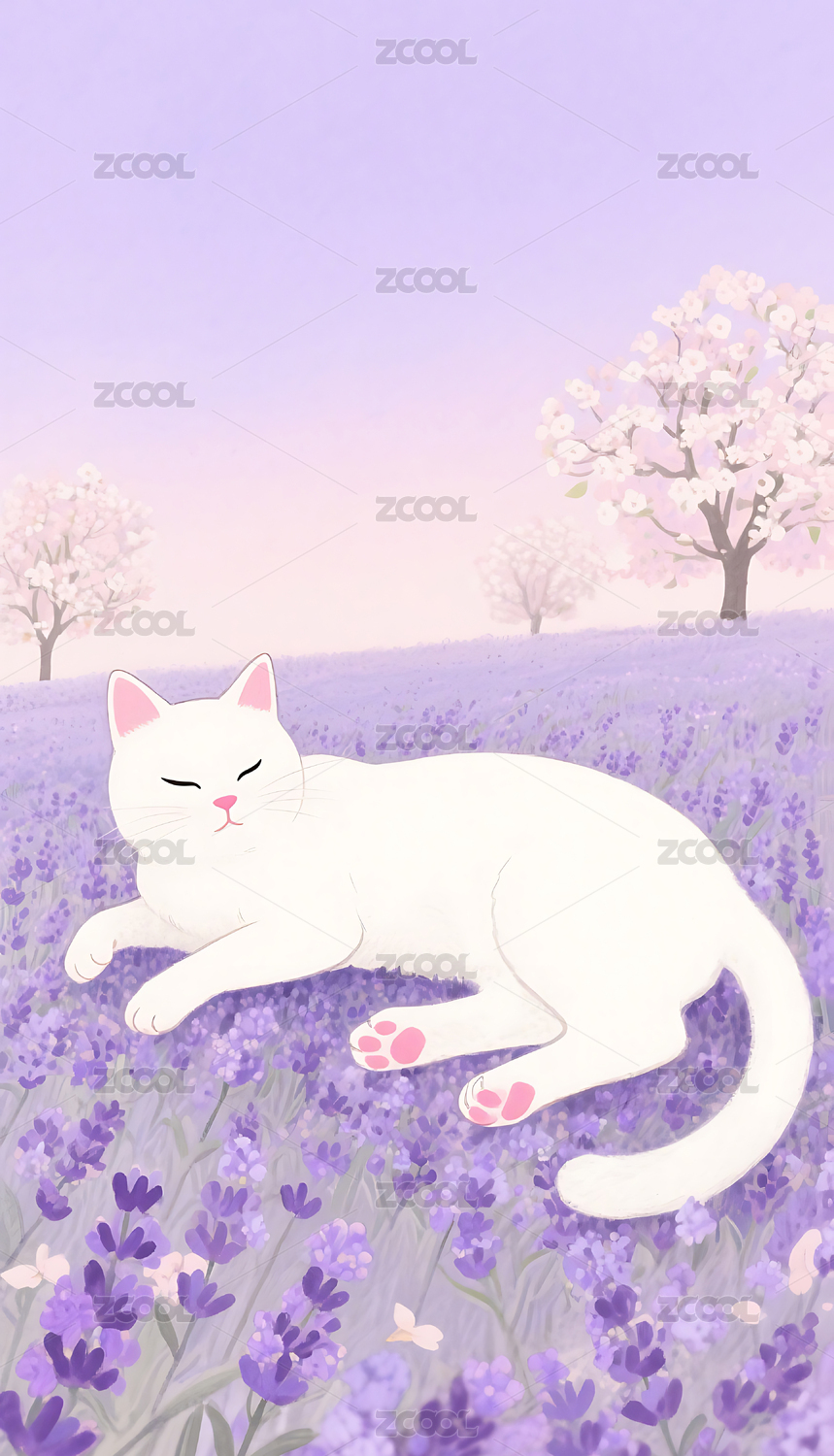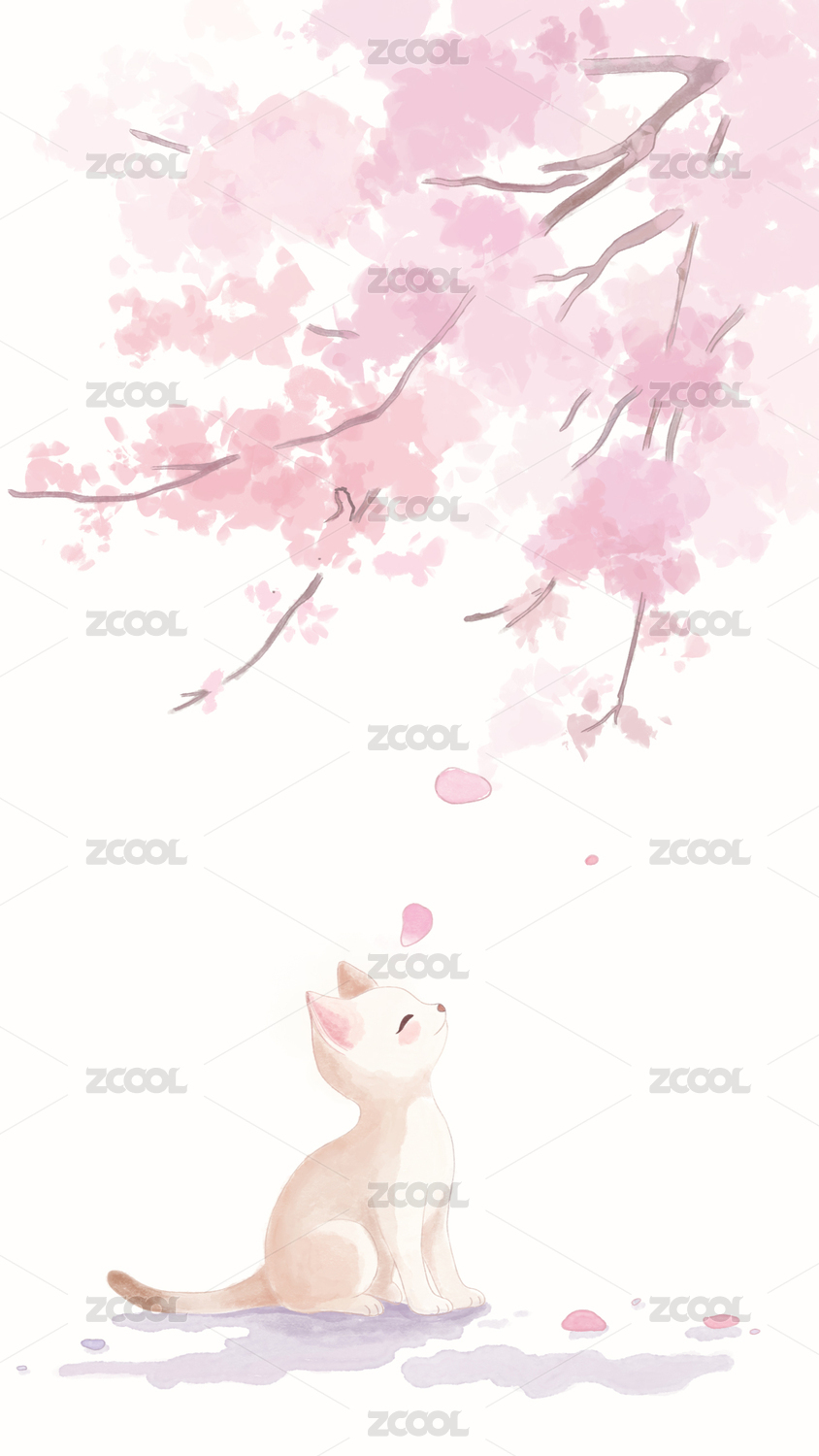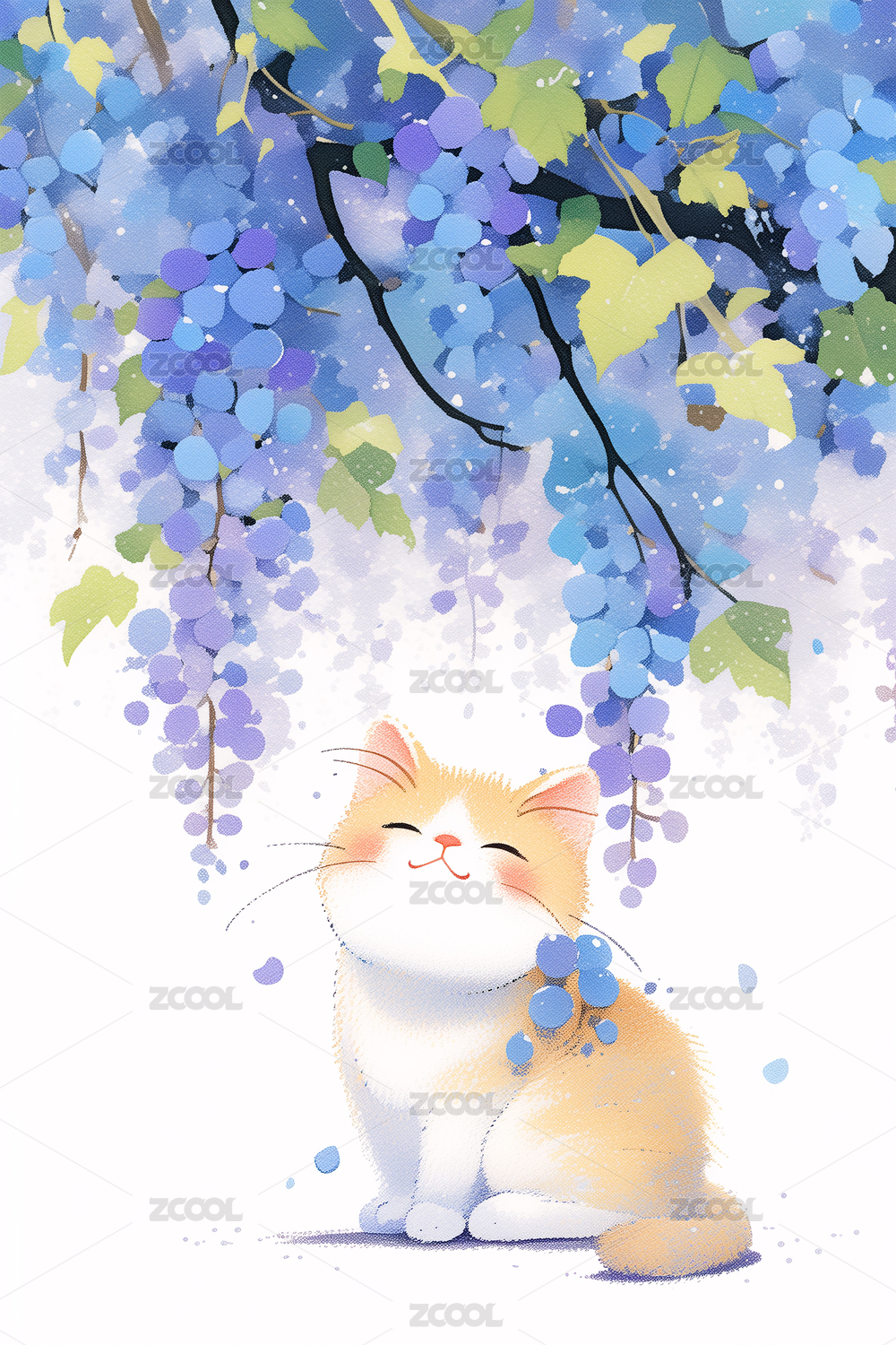 可爱猫咪蹲在紫藤花下治愈谷雨节气插画