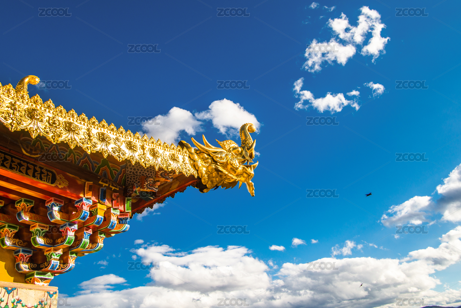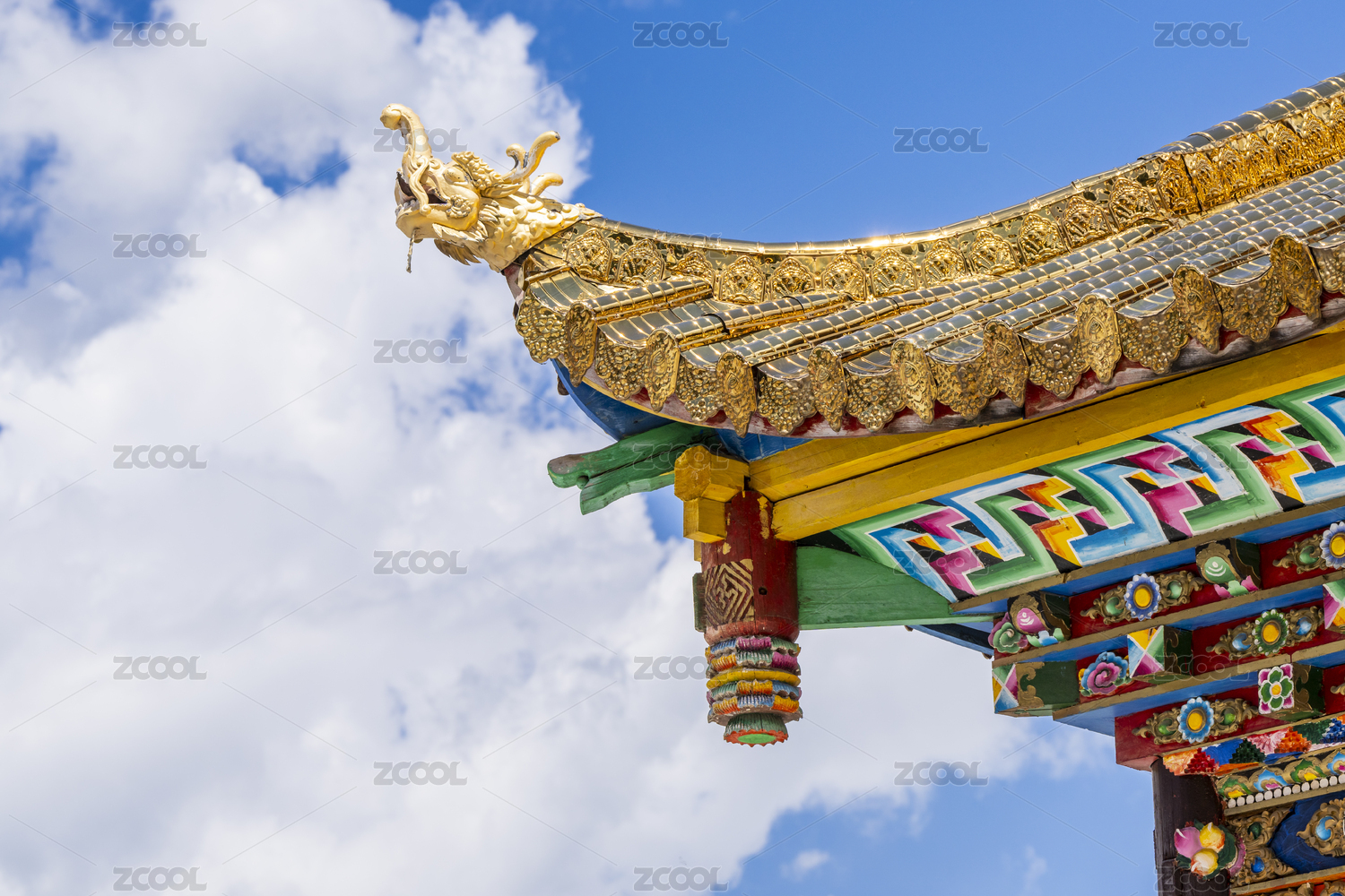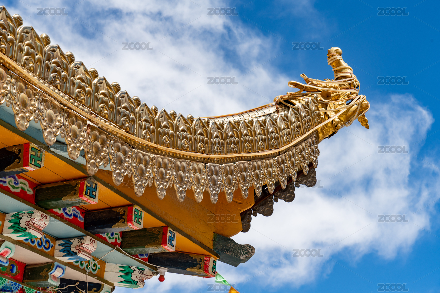 阿坝州松潘县川主寺藏族寺庙金色的屋檐特写