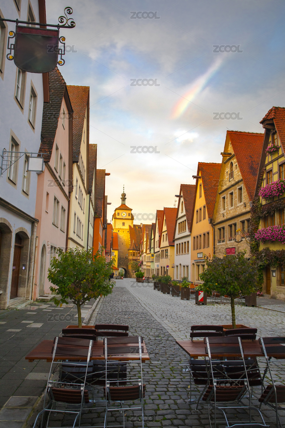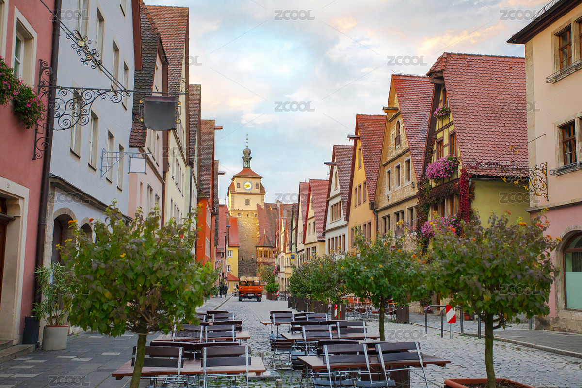 德国罗腾堡童话镇街道上美丽的露天咖啡座