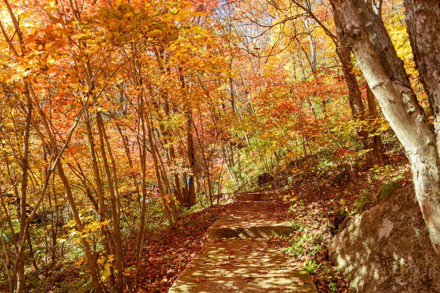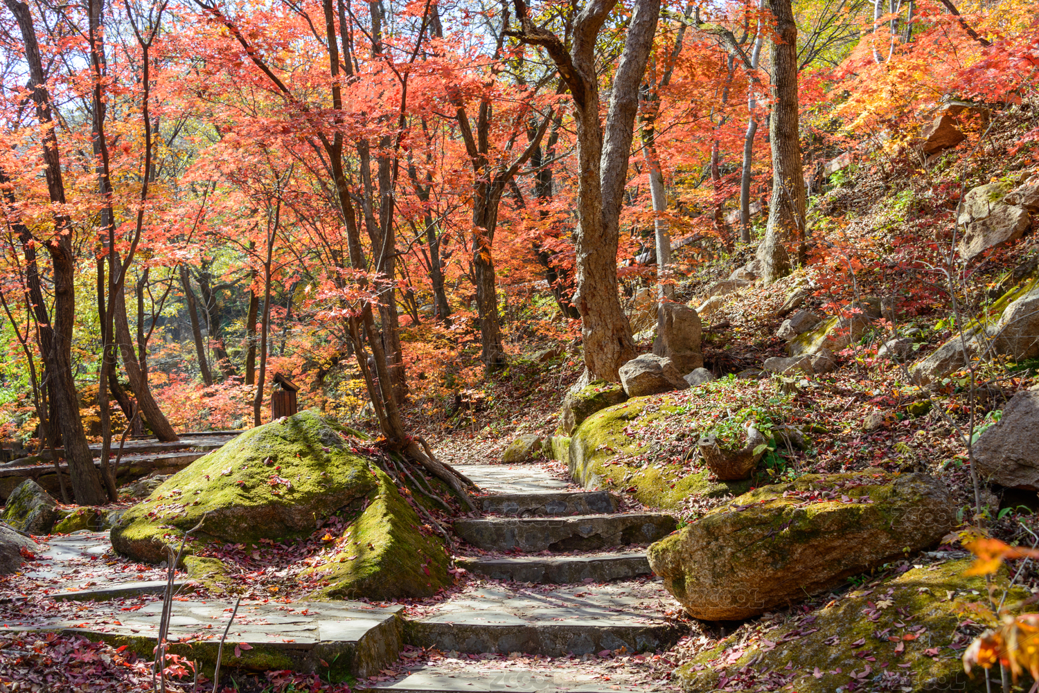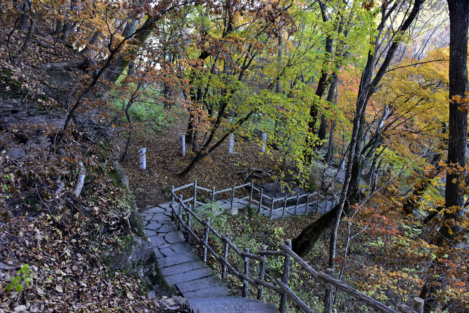 沈阳本溪老边沟,秋季多彩枫叶林间小路风光