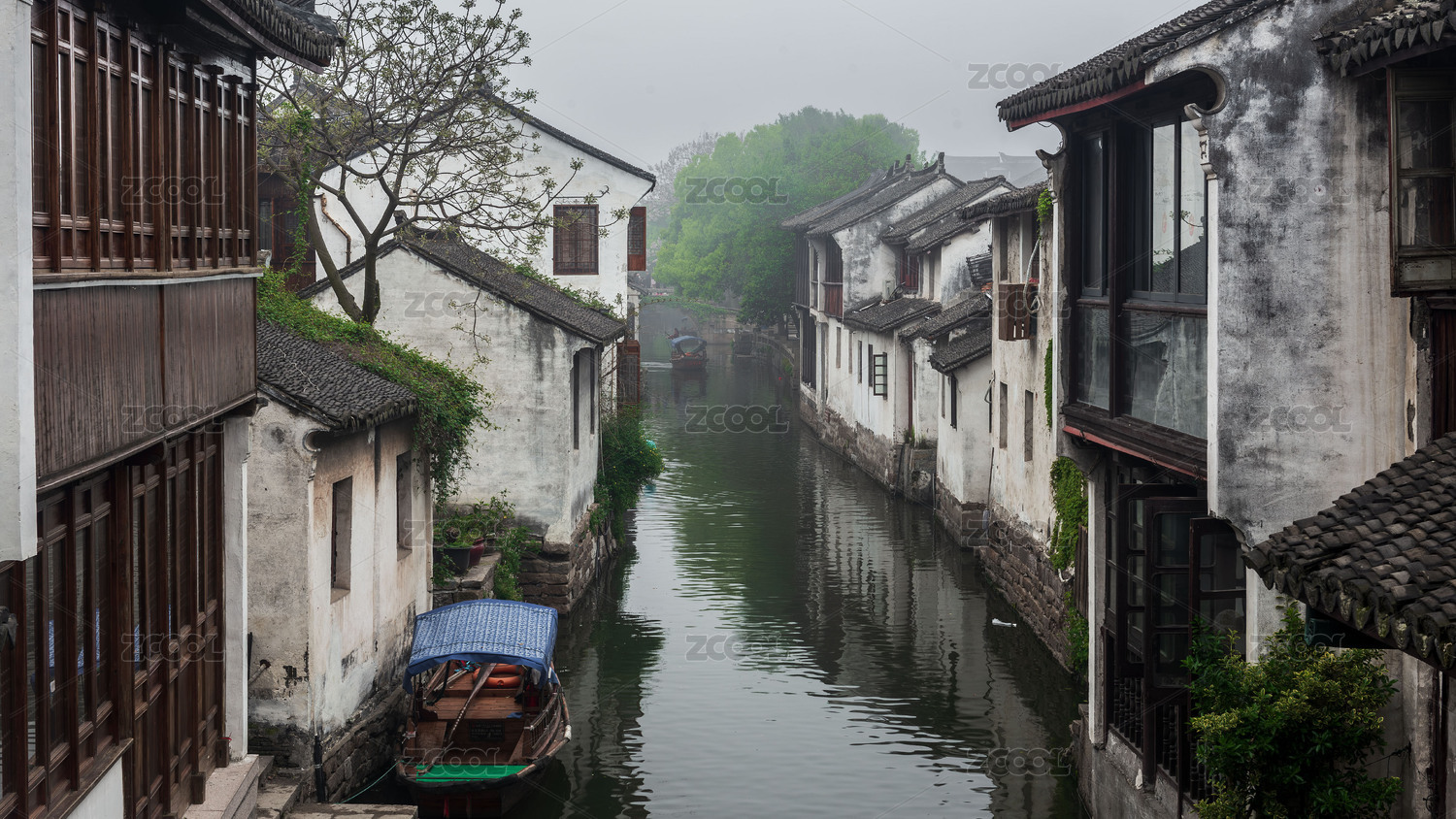 江南水乡晨雾小船