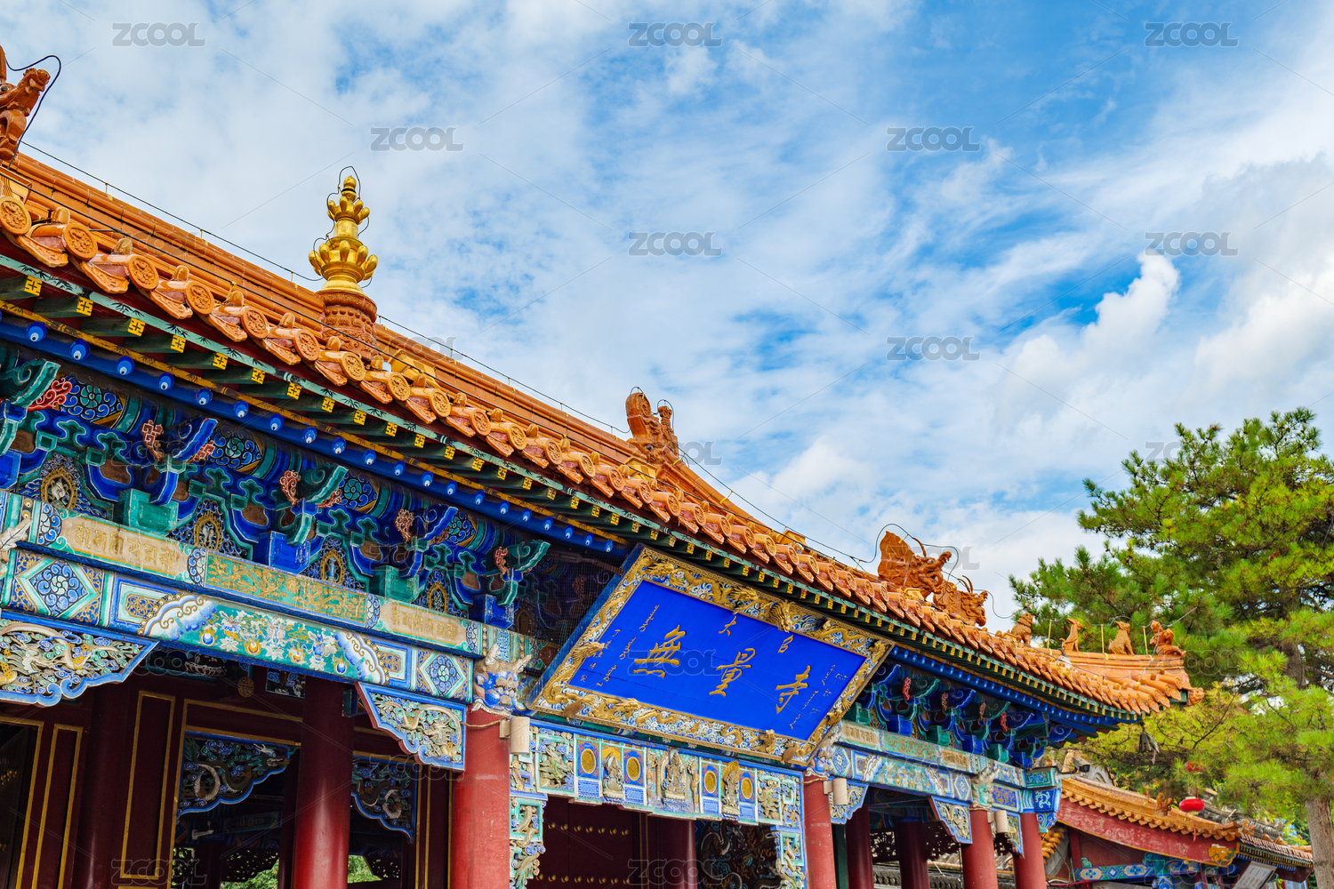 中国北京景山公园古建正面一角—琉璃瓦屋顶飞檐彩绘描金万字纹龙纹