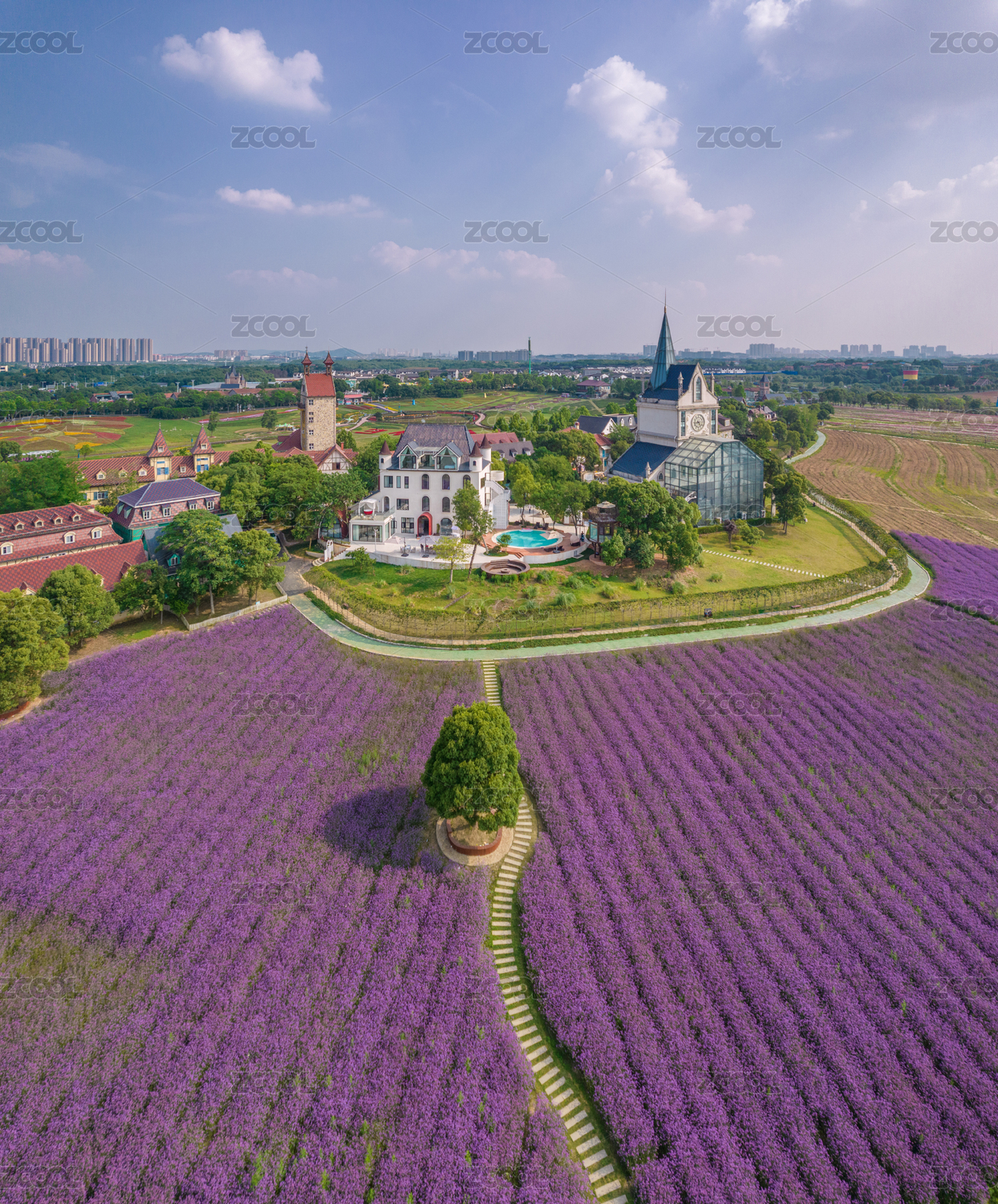 航拍中国湖北武汉花博汇景区马鞭草花海