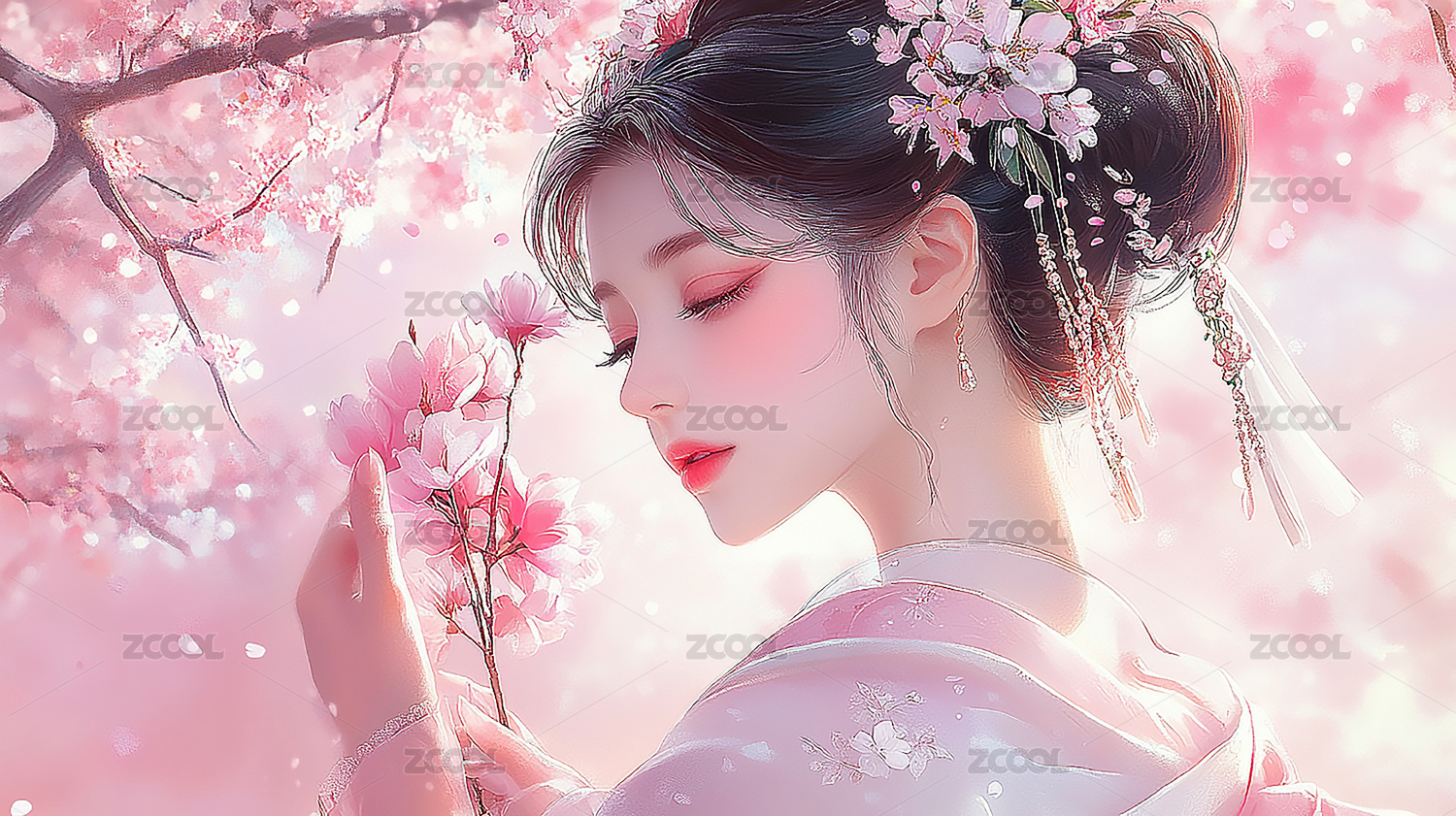 唯美古风女子花间侧颜,妆容精致优雅动人