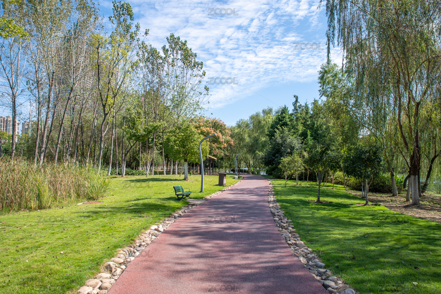 蓝天白云下的公园跑道