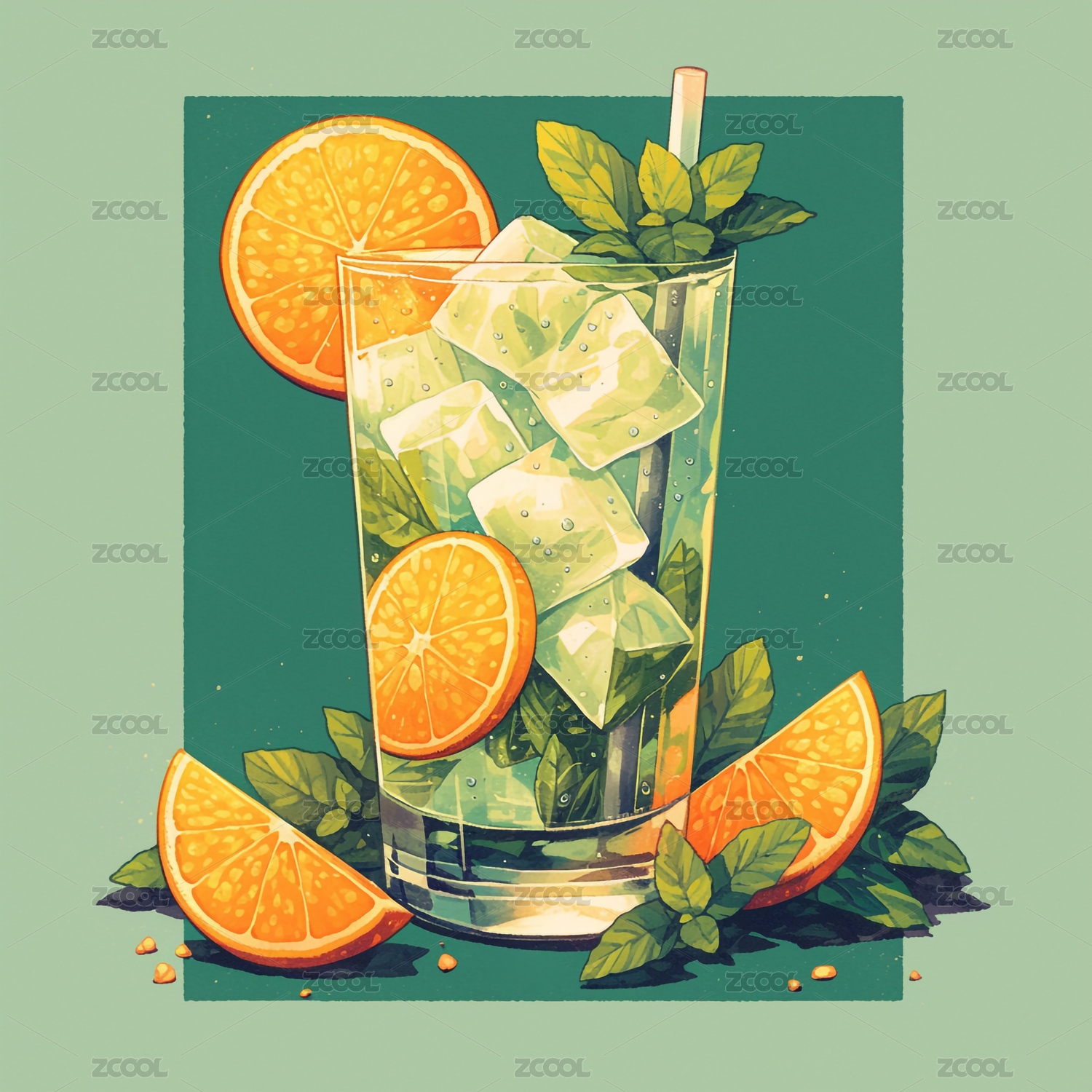 卡通美式复古风格清新冰爽的橙汁饮料