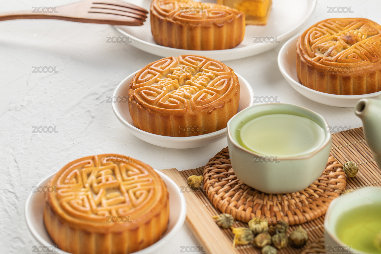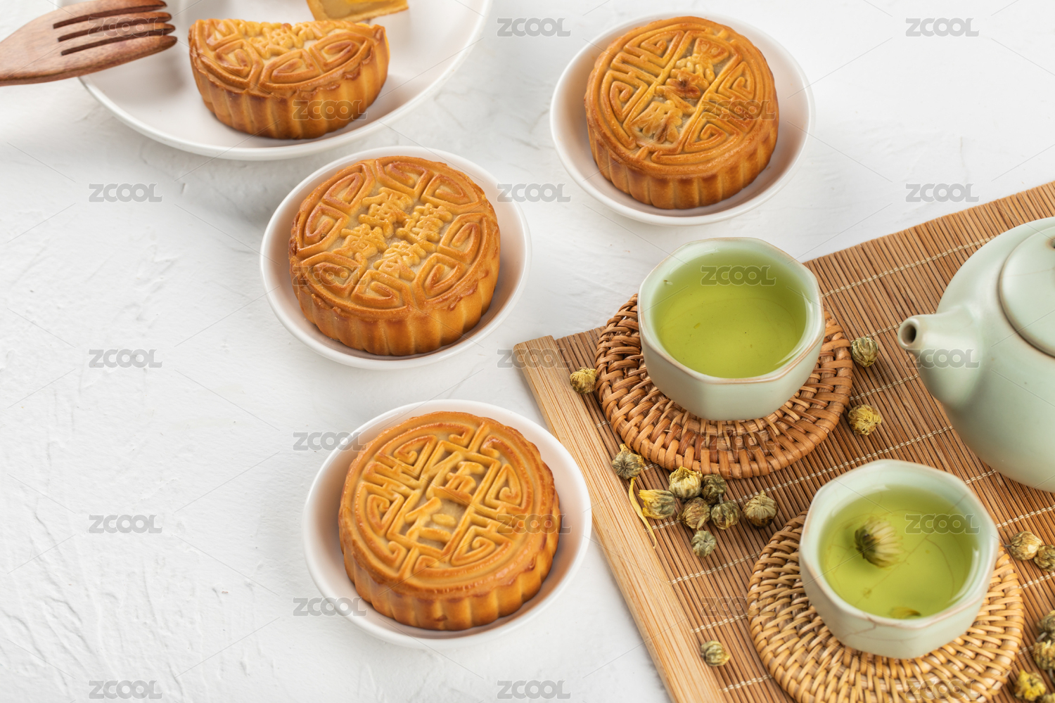淡绿色背景上的中秋节月饼、功夫茶和满月