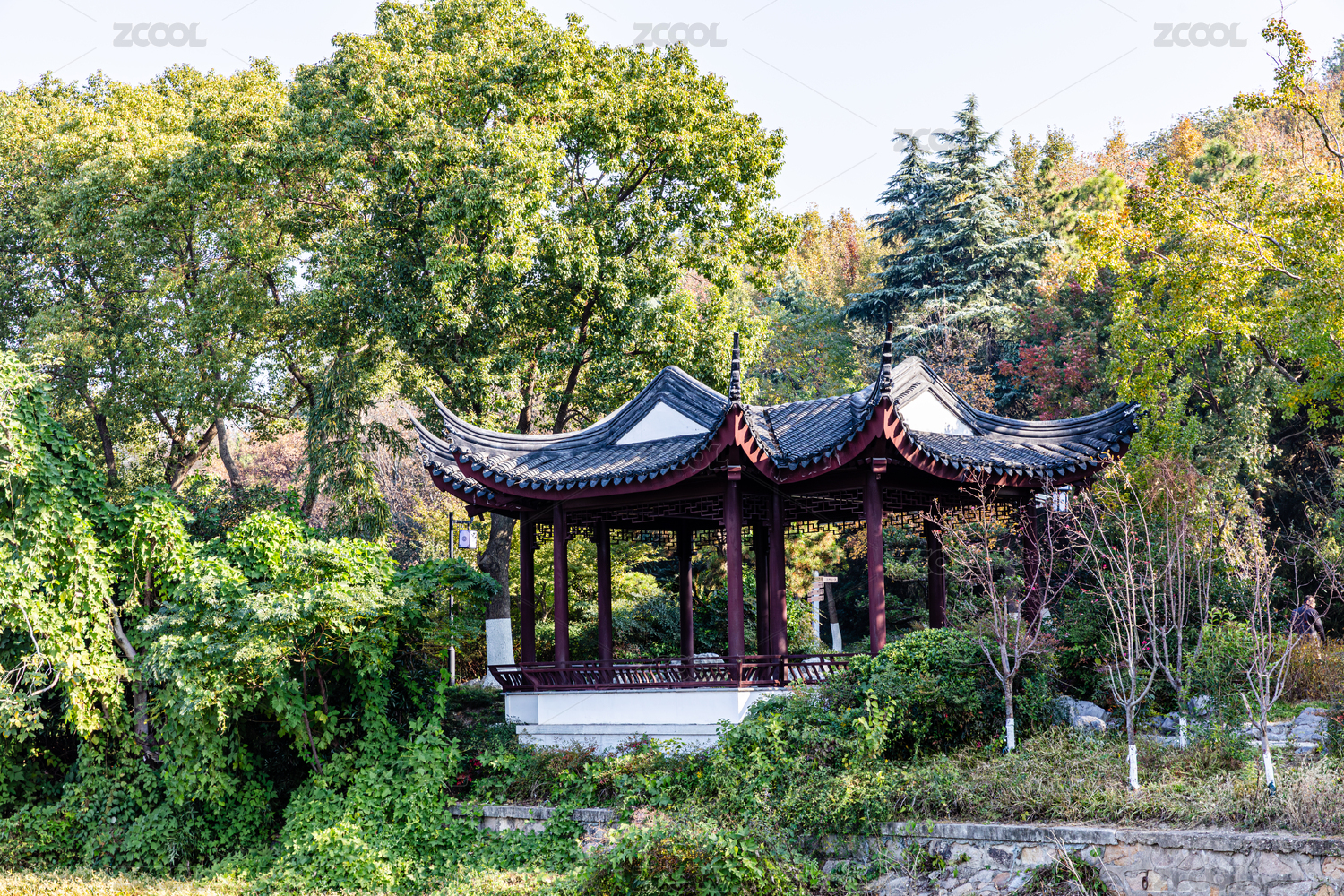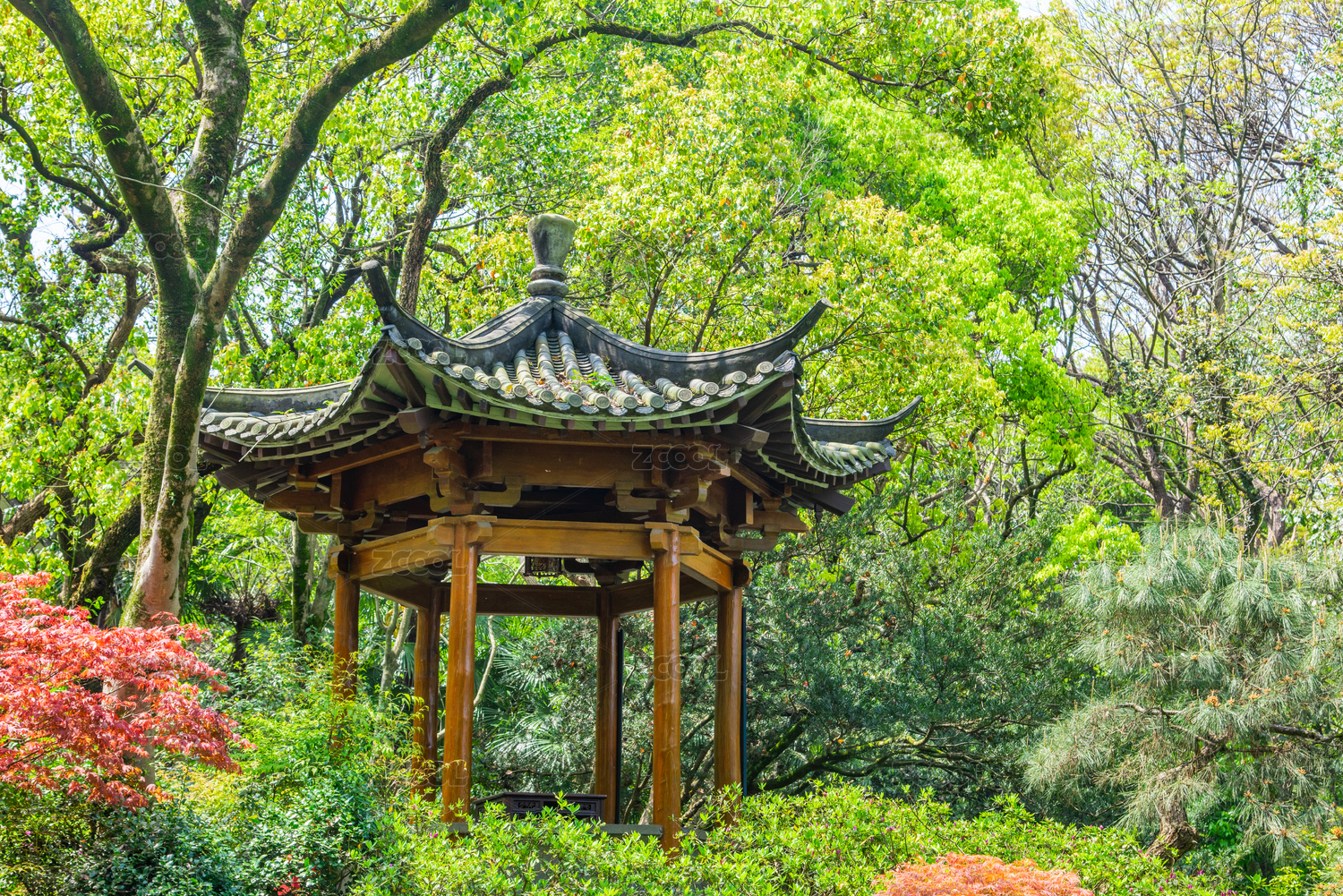 中国浙江杭州西湖畔花港公园园林建筑风光